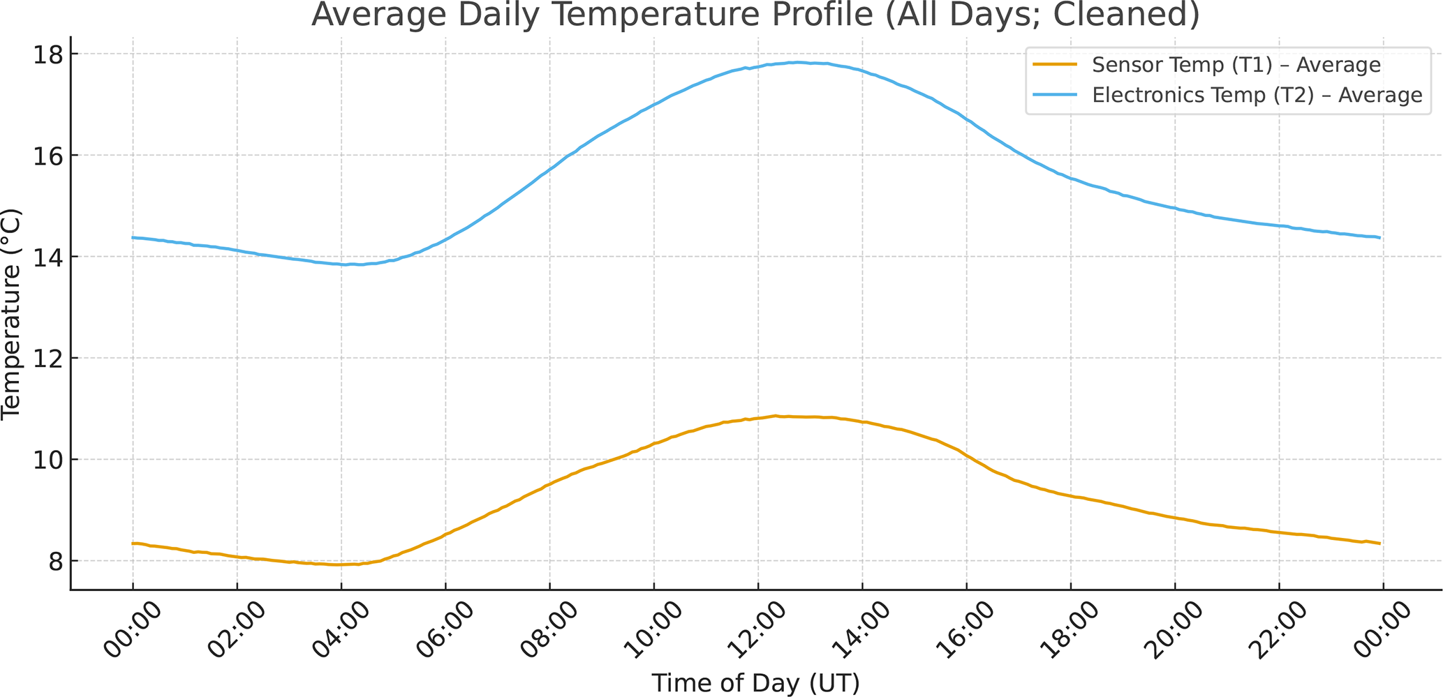 Figure 3Average daily temperature profile inside the Entoto station enclosure, derived from all days of the last months .sec data (9 August–9 September 2025). Sensor temperature (T1) and electronics temperature (T2) both show modest diurnal variations (median daily ranges of ∼3.5 and ∼4.6 °C, respectively), confirming that the enclosure moderates the thermal environment.