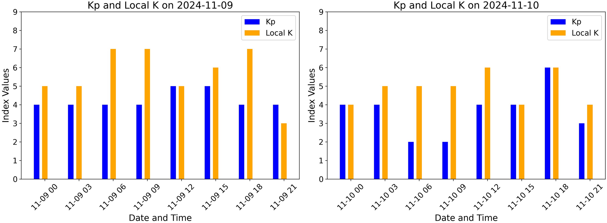 Figure 6Kp and local K indices derived from the Entoto station. These figures show indices as measured during disturbed storm times, as seen in Fig. 5.