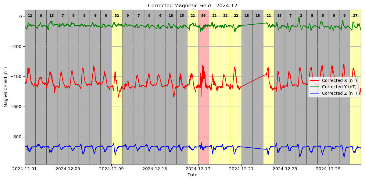 Figure 7Variations in the local geomagnetic field along the X (red line), Y (green line), and Z (blue line) components during December 2024. As described in Fig. 5.