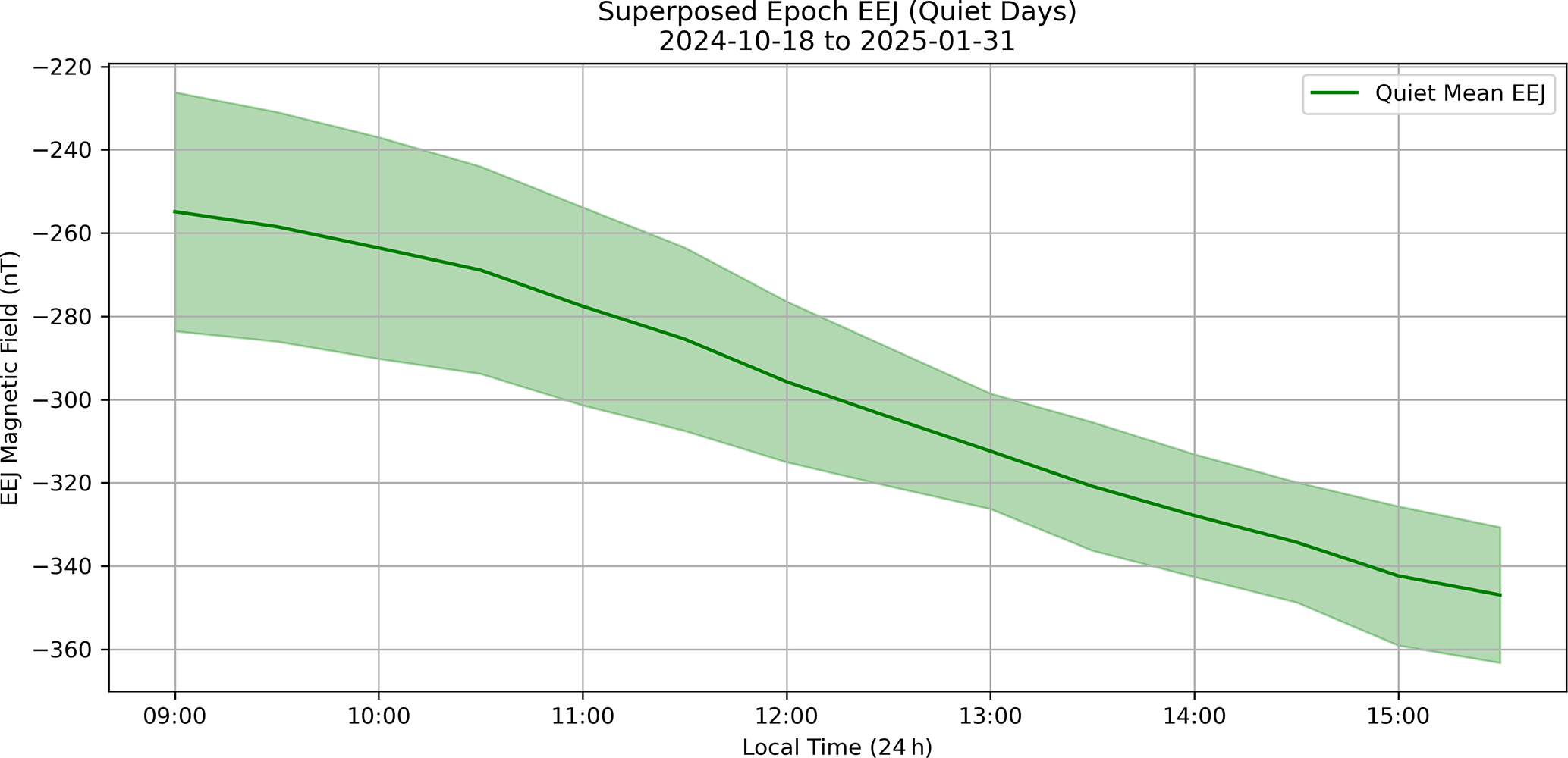 Figure 11Mean EEJ amplitude for selected quiet geomagnetic days for the selected date range, based on the daily mean of 1 min EEJ values. These values provide a baseline for comparison with disturbed-time EEJ enhancements.