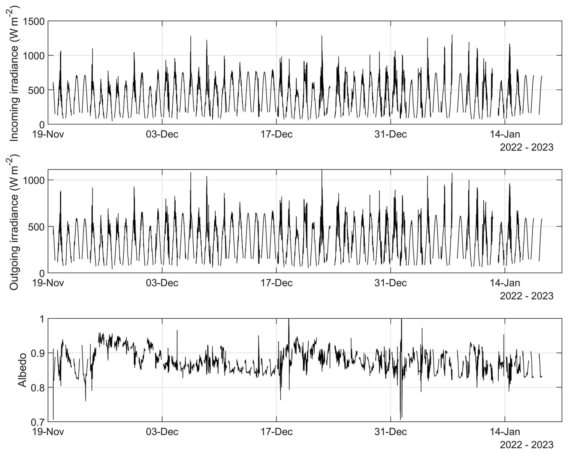 Eppley radiation station (Fig. 5b) was installed at the AWS5 site on 19 November 2022 and disassembled on 19 January 2023. The radiation station has two broadband upwelling and downwelling radiative flux sensors observing shortwave (280–2800 nm) and longwave (4–50 µm) radiation wavelengths. The sensors were not ventilated due to power limitations in the field conditions, but regular visits were made to maintain the station. Incoming and outgoing irradiances and albedo are presented for the measurement period in Fig. 6. Albedo values > 1.0 on 18 December and 1 January were filtered, which correspond to broken-cloud conditions where concurrent enhancement or inhibition of incoming solar flux by cloud shadowing of the direct radiation path and e.g. cloud side reflections combine with alteration of reflected flux by moving cloud shadows in the pyranometer field of view, creating conditions where the measured apparent albedo of fine-grained dry snow may variably exceed 1.0 or be suppressed to 0.8. The instrument has two support legs and the sensors are installed to a bar between them. Installation was made so that shades were minimized on the instrument field-of-view area at noon. The height of the sensors was approximately 120–140 cm above the snow surface depending on whether there was new or drifted snow below the instrument.