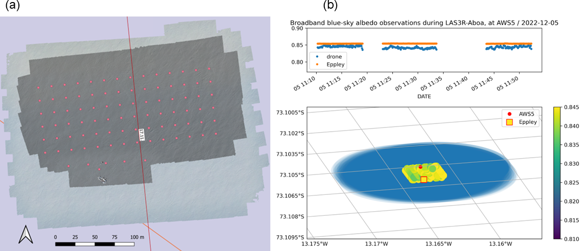 Figure 7(a) Example of hyperspectral camera spectral radiance data in channel 501 nm on 23 November 2022. (b) Example of CM11 data on 5 December 2022. Top panel presents broadband blue-sky albedo from the drone and Eppley in UTC time. In the lower panel, spatial variability of CM11 albedo is shown and the blue area presents the field of view of the CM11 instrument at the flight altitude.