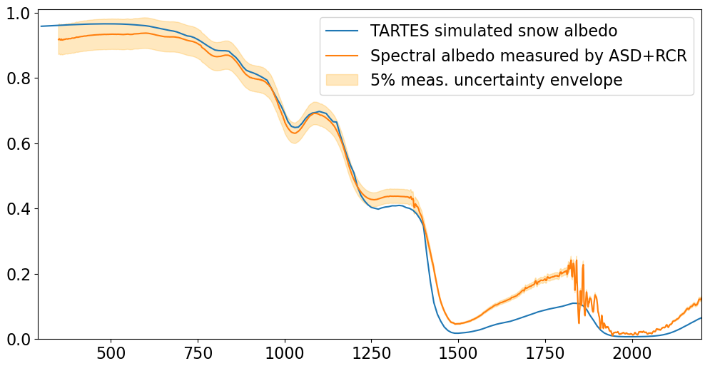 Figure 8Spectral albedo measured with ASD spectroradiometer using an alternation of RCR foreoptic pointing up- and downward on 5 January 2023, a clear-sky day and simulated black-sky snow albedo with TARTES model with inputs consistent with observed conditions.