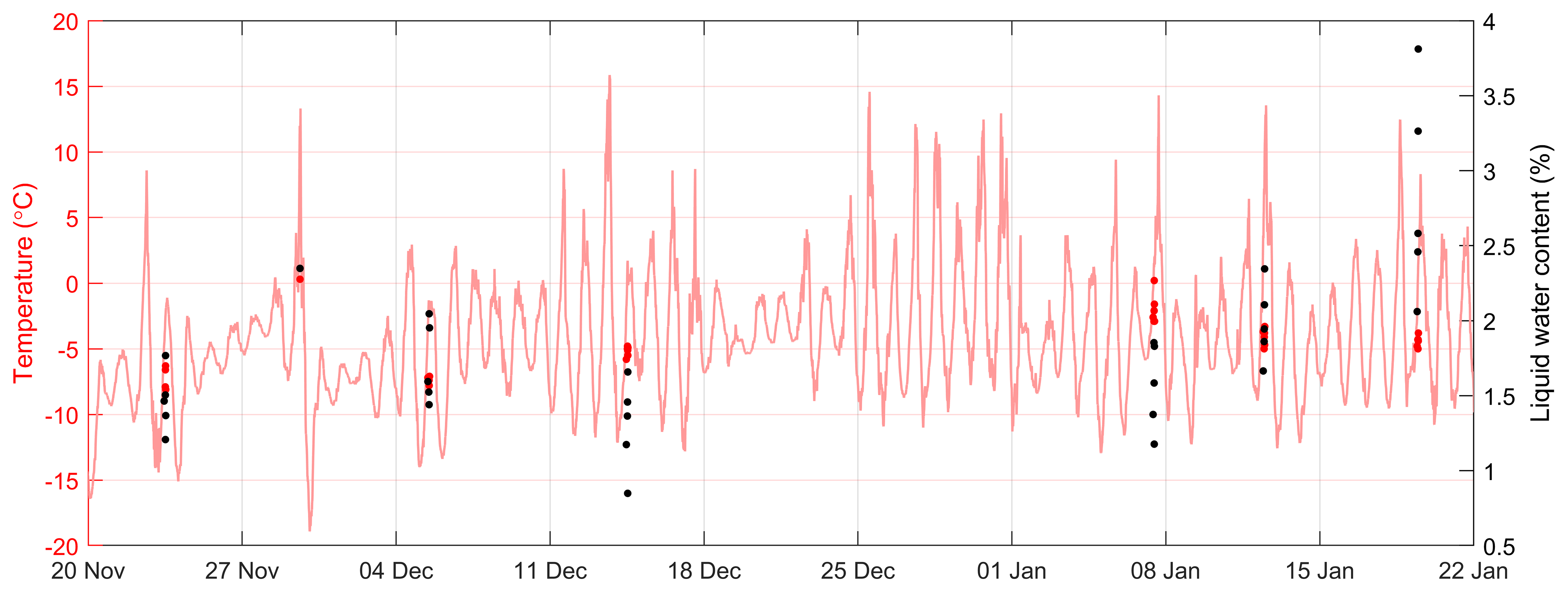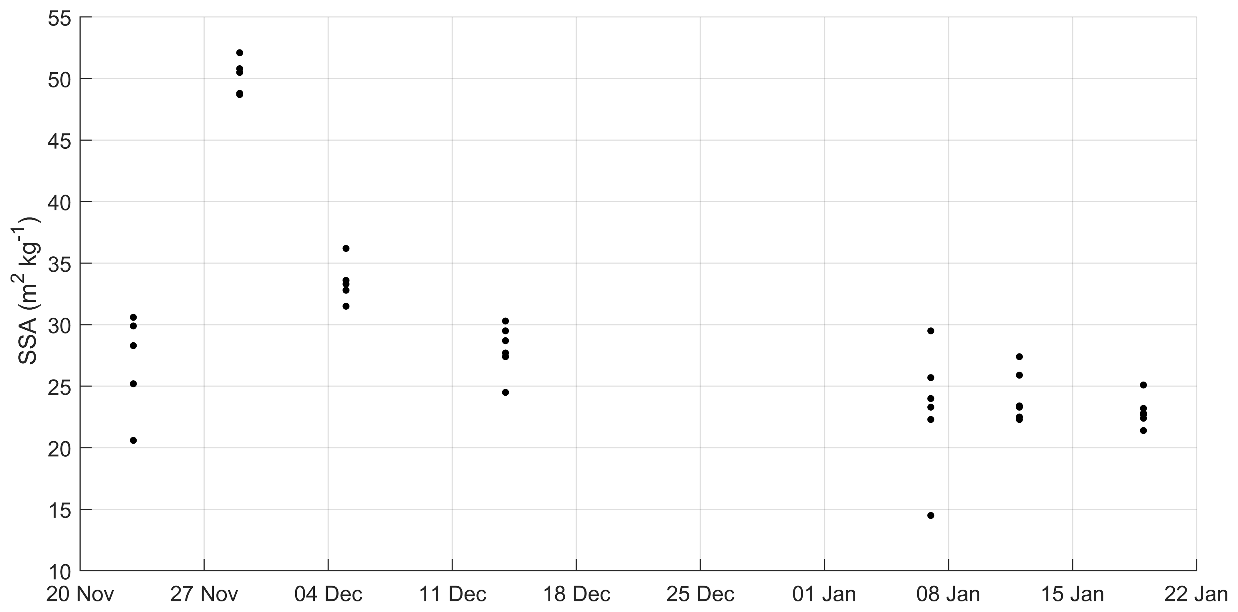 The snowpack in the region consisted mostly of rounded grains (Fig. 10). However, new precipitation particles were deposited on top after a snowfall on the second measurement day in November. Additionally, some ice or crust layers were occasionally detected. Average SSA was 29.4 m2 kg−1 and SSA values varied between 14 and 52 m2 kg−1 (Fig. 11). However, SSA values were typically between 20 and 35 m2 kg−1. SSA was highest, around 50 m2 kg−1, for the second measurement day in November when the observed grain type was precipitation particles. Average density was 410 kg m−3 and density varied between 250 and 520 kg m−3 (Fig. 12). Values measured from the surface were generally close to the values measured from the profile. However, surface values were more often the smallest or largest values from the day. Average liquid water content was 1.8 % and values varied between 0.8 % and 3.8 % but most typical values lie between 1 % and 2 % (Fig. 13). Average surface temperature was −4.6 °C and it varied from −8.1 to +0.2 °C. Highest surface temperature was not indicating the highest liquid water content.