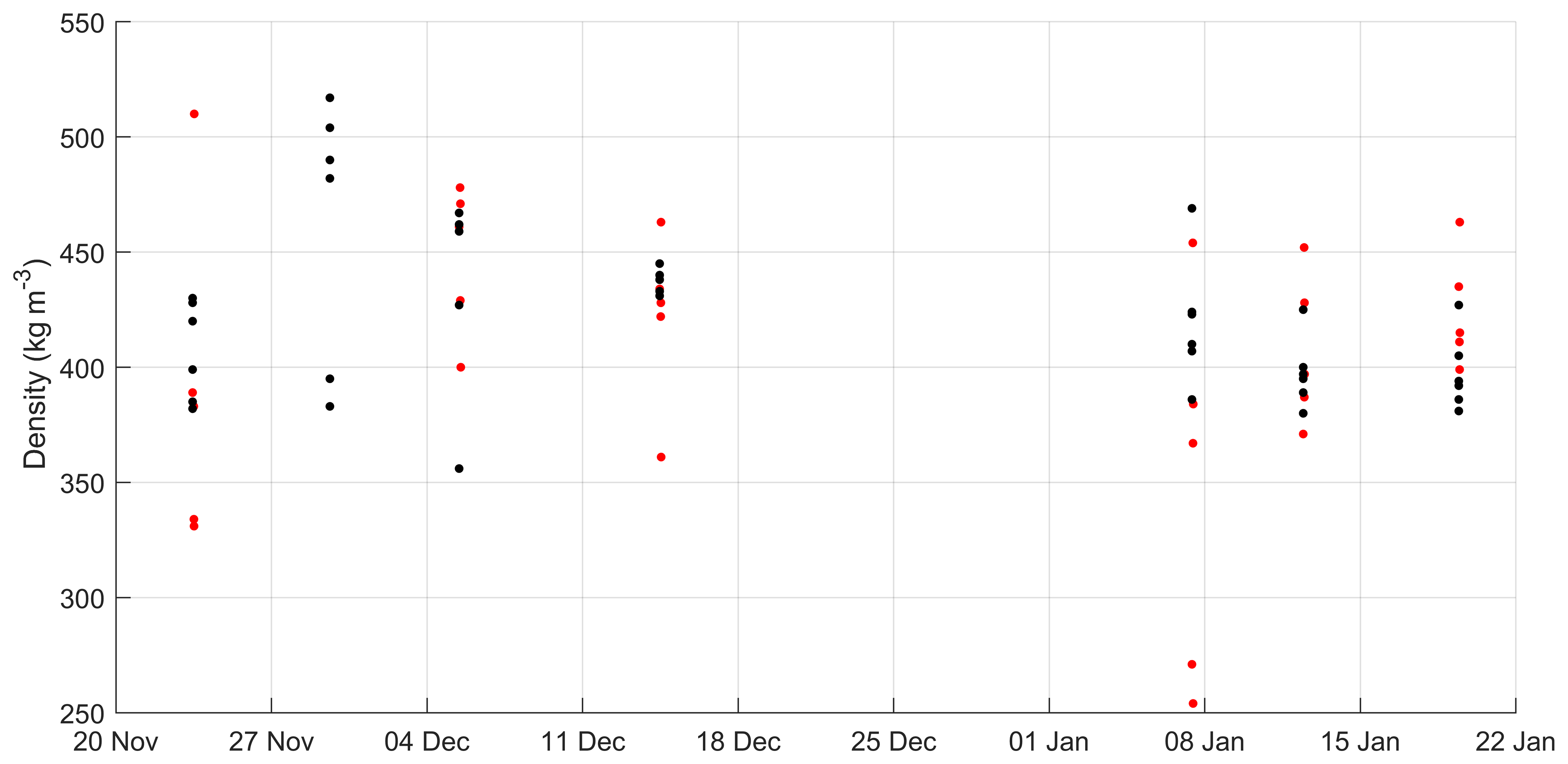 Figure 12Density measured at the snow pit profile every 3 cm (black) and distributed density measurements from the snow surface (red) at the AWS5 site.
