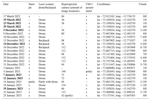 Aboa is located in the snow accumulation area (Isaksson and Karlén, 1994; Reijmer and Broeke, 2003). The field measurements were made weekly at AWS5 weather station (lat −73.105034, long −13.162370), approximately 10 km from Aboa station, and at different satellite overpass locations on pre-checked GPS routes typically 5–35 km from the station. Measurement configurations and coordinates are presented in Table 2. The presented data in this paper are from the AWS5 site, where seasonal snow evolution was monitored. Measurements included automated meteorological measurements at the weather station, snow pit measurements, radiation observations on the ground, radiation observations on a drone, and snow surface roughness observed with a drone-based laser scanner and a backpack-based laser scanner (Table 3). In total eight measurement occasions were made at AWS5 site and 16 measurements at different IceSat-2 and CryoSat-2 satellite overpass locations, including measurements at Riiser-Larsen shelf-ice approximately 100–130 km north-west from the Aboa station (Figs. 1 and 2), between November 2022 and February 2023.