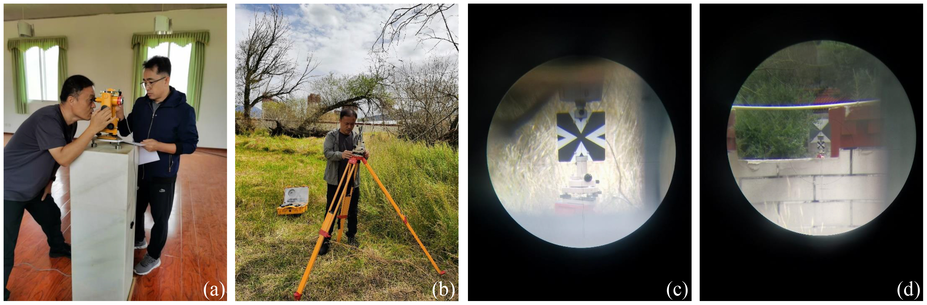 To achieve collinearity among the four elements, the following operational procedures must be strictly followed: First, set up the theodolite on the observation pillar inside the observation room, and precisely adjust it to ensure the instrument's center aligns perfectly with the pillar's center. Then, perform meticulous theodolite leveling. After leveling, aim at the azimuth mark through the theodolite's telescope, and once the crosshairs coincide exactly with the azimuth mark's center, lock the theodolite's horizontal circle at this position (while keeping the vertical circle freely rotatable). Next, mount the leveling base and GNSS target on a tripod, employing a two-person coordination method – one moving the tripod and the other observing through the theodolite's telescope. Position the tripod within the telescope's field of view, then gradually adjust its placement until the GNSS target infinitely approaches the line defined by the crosshairs and the azimuth mark. Secure the tripod afterward. At this point, adjust the leveling base. After leveling, the GNSS target may deviate from the line, requiring another fine adjustment to realign the mark, followed by re-leveling. This cycle must be repeated multiple times until the base is perfectly level and the GNSS target precisely lies on the line. Only after fulfilling these conditions can the GNSS receiver be mounted on this tripod system. The same procedure is applied to the second tripod. Ultimately, ensure the four elements are rigorously collinear. As shown in Fig. B1, images illustrate the alignment process from the observation pillar to the GNSS targets and the azimuth mark. Figure B1a demonstrates azimuth mark alignment: After precisely centering the azimuth mark using the telescope crosshairs, the horizontal circle should be locked in place. Figure B1b shows positioning: The tripod with the GNSS target should be aligned with the sightline formed by the telescope crosshairs and the azimuth mark. Figure B1c depicts first aligned GNSS receiver, while Fig. B1d presents second aligned GNSS receiver and azimuth mark.