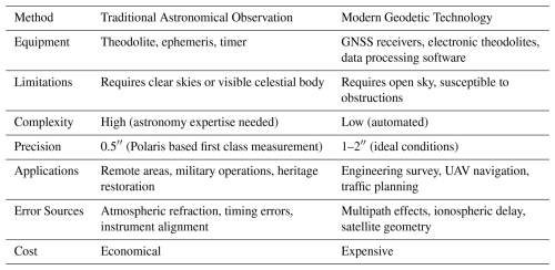 A brief comparison between the traditional astronomical observation methods and Modern geodetic technologies is presented in Table 1. Both the methods can achieve high-precision observations, yet each has its own applicable environments.