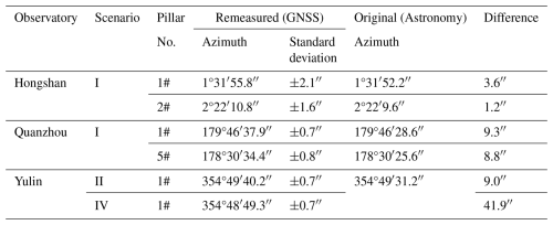 In the azimuth remeasurement work at these three geomagnetic observatories, we uniformly used the GNSS equipment with the rapid static horizontal accuracy 2.5 mm + 0.5 ppm RMS, employed the Zeiss Theo 010B theodolite with an angular measurement accuracy of 1cc (0.324′′), war used for collinearity alignment and angle measurement. Additionally, three sets of data were collected for each GNSS survey line (in the WGS84 coordinate system), and the mean value and standard deviation are presented in Table 2. Most of the differences between the re-measured azimuths and the original astronomical azimuths are within the range of 0–9′′. However, in the Scenario IV test at Yulin observatory, a significant deviation (41.9′′) was observed between the measured and original results. Three primary factors may contribute to this result. The first one is the insufficient GNSS baseline length. Despite the RMSE of three measurement sets remained stable at 0.7′′, the short distance between two GNSS points (about 60 m) and the maximum horizontal error (about 2.5 mm) may introduce the potential angular error of up to 8.6′′. The second one is the theodolite setup error. In this scenario, the theodolite needs to be installed on the tripod at point A, as shown in Fig. 5b. During angle measurement process, a centering offset was detected on the tripod. After re-centering, a change of 10.8′′ occurred. This underscores the necessity of adequate baseline distances and highlights the need for further analysis of tripod measurement error characteristics. The last one is that measurement errors will be introduced when measuring the angles between the azimuth mark and the GNSS target in Scenario II and IV using theodolite. In this work, each angle was measured 6 times. The standard deviation of angle a in Fig. 3 of Scenario II is 2.5′′, and standard deviation of angle a1 and a2 in Fig. 5b of Scenario IV are 3.3′′ and 1.8′′, respectively. It can also be noted that the standard deviation of the angle (a and a2) measured on the observation pillar is smaller than that (a1) on the tripod. Therefore, the stability of observation points is also important. Compared with the difference in Table 2, the measurement errors cannot be ignored in the analysis. In order to reduce the error introduced by the measured angle, it is necessary to increase the number of repeated measurements.
