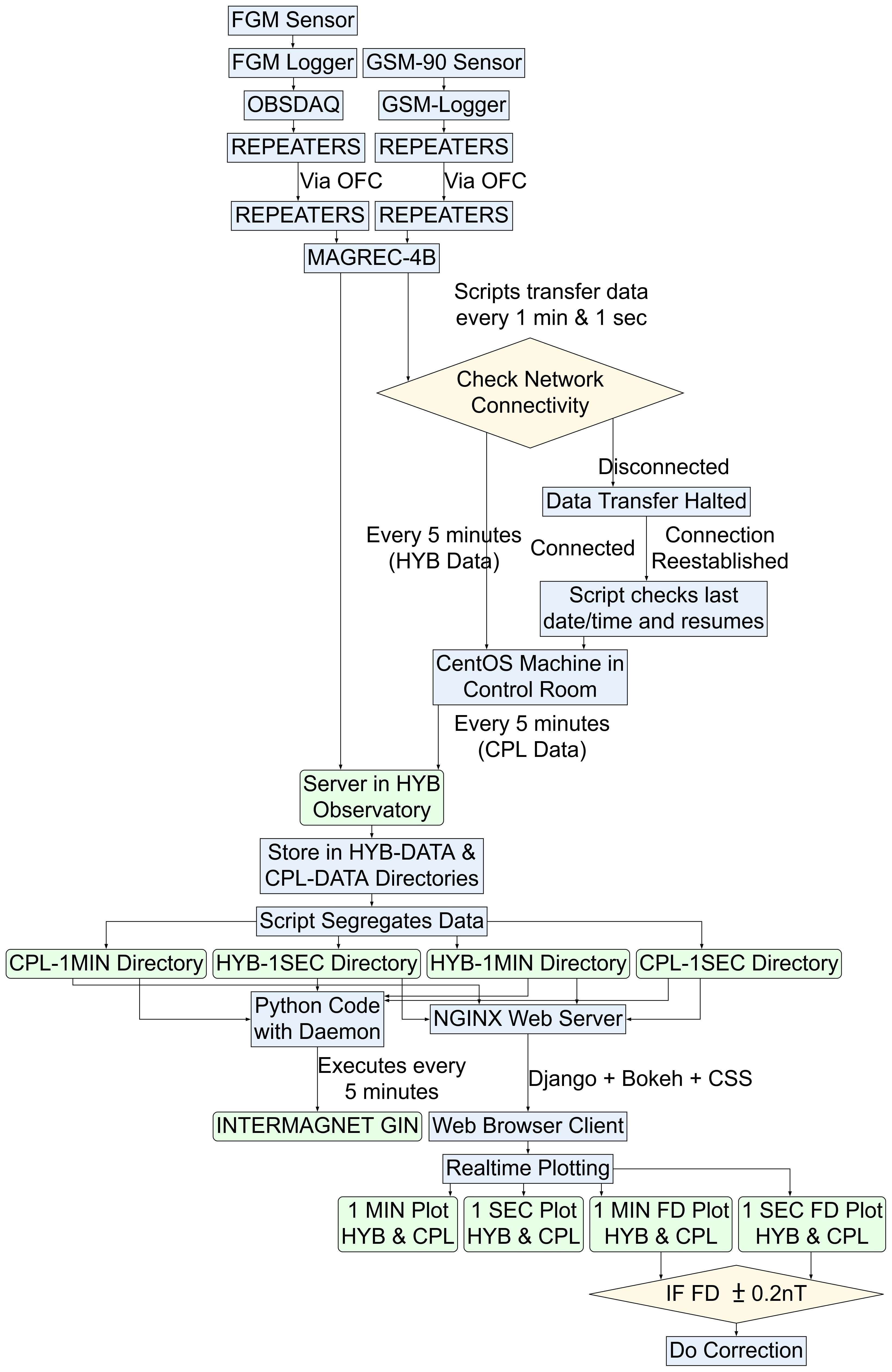 The segregated data from the HYB server are then prepared for transmission to the INTERMAGNET GIN located in Edinburgh, UK. This transmission process is automated using Python scripts and daemon processes that run in the background. These scripts are designed to execute every 300 s, ensuring timely and regular data updates without duplication. The Python code handles data packaging, error checking, and retransmission logic to ensure reliable data delivery.