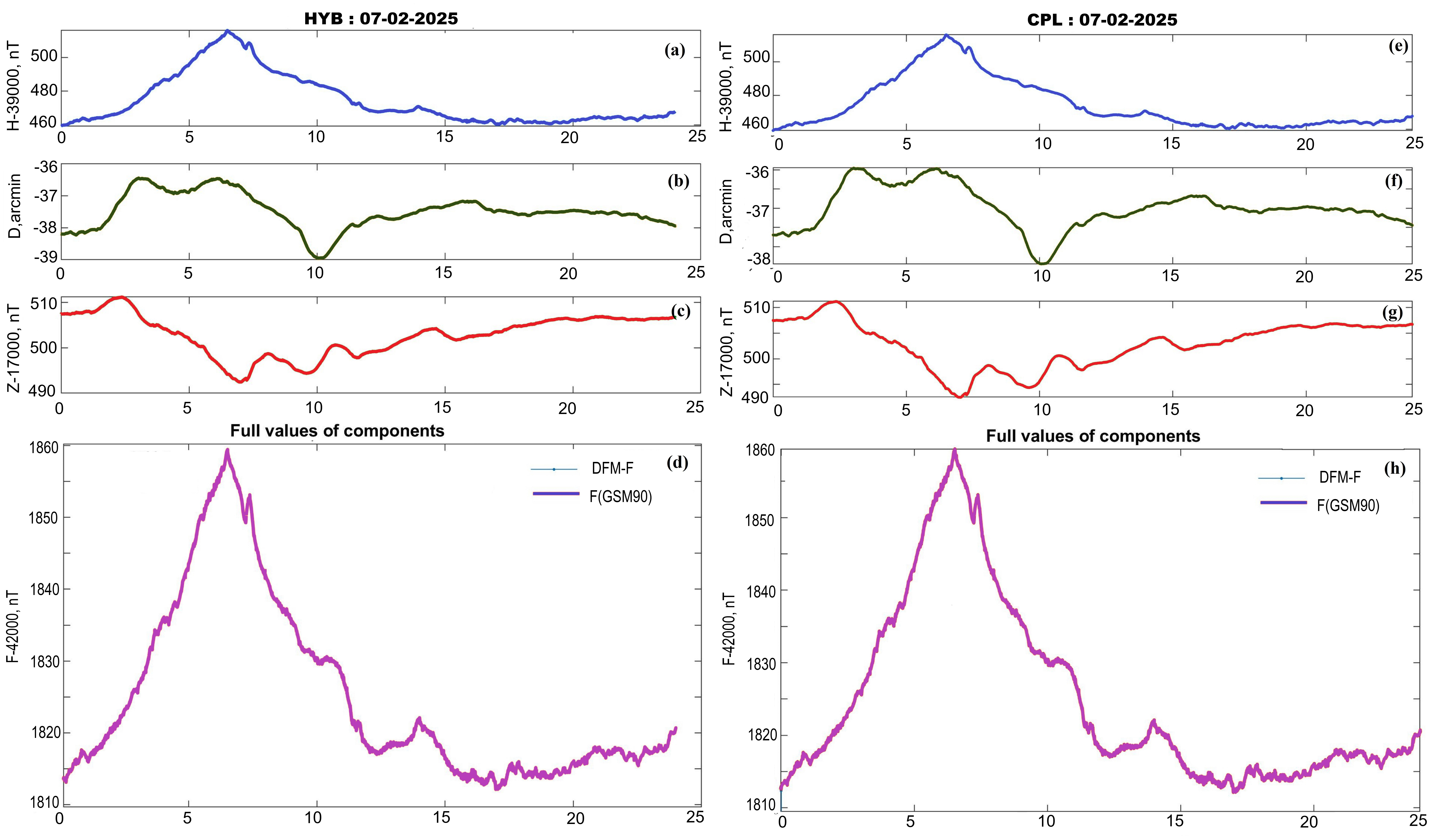 Figure 1Real-time plotting of vector and scalar data at 1 min sampling interval from the HYB (left) and CPL (right) observatories of CSIR-NGRI.
