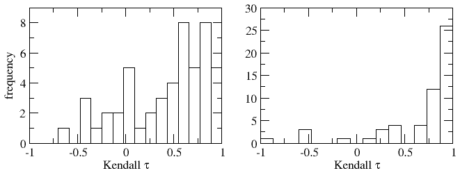 Figure 1Histograms of Mann-Kendall coefficients of monotonic trends in early-warning indicators for dewpoint (left panel) and relative humidity (right panel). The window size for calculation of indicators was 10 % of time series length (as the records had different lengths). High positive values of the coefficient denote significant increasing trend indicating EWS.