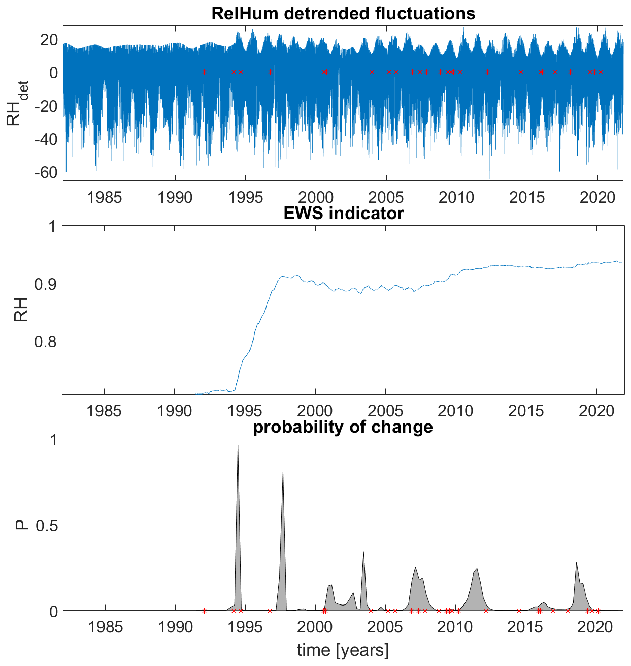 Global trend and seasonality were removed using SSA (singular spectrum analysis) (Broomhead and King, 1986) from both dewpoint and relative humidity variables. SSA decomposes the input time series into a sum of components (low-frequency trend, seasonal modulations, and detrended noise). The method is based on the singular value decomposition of a special matrix constructed from the time series. The advantage of the method is that neither a parametric model nor stationarity conditions are to be assumed for the time series. This makes SSA a versatile tool of time series analysis. Detrending using SSA can affect the level of autocorrelations but not the trend in the indicator time series. EWS is estimated as monotonous positive trend, and this trend is present in both indicators of the raw and detrended data.