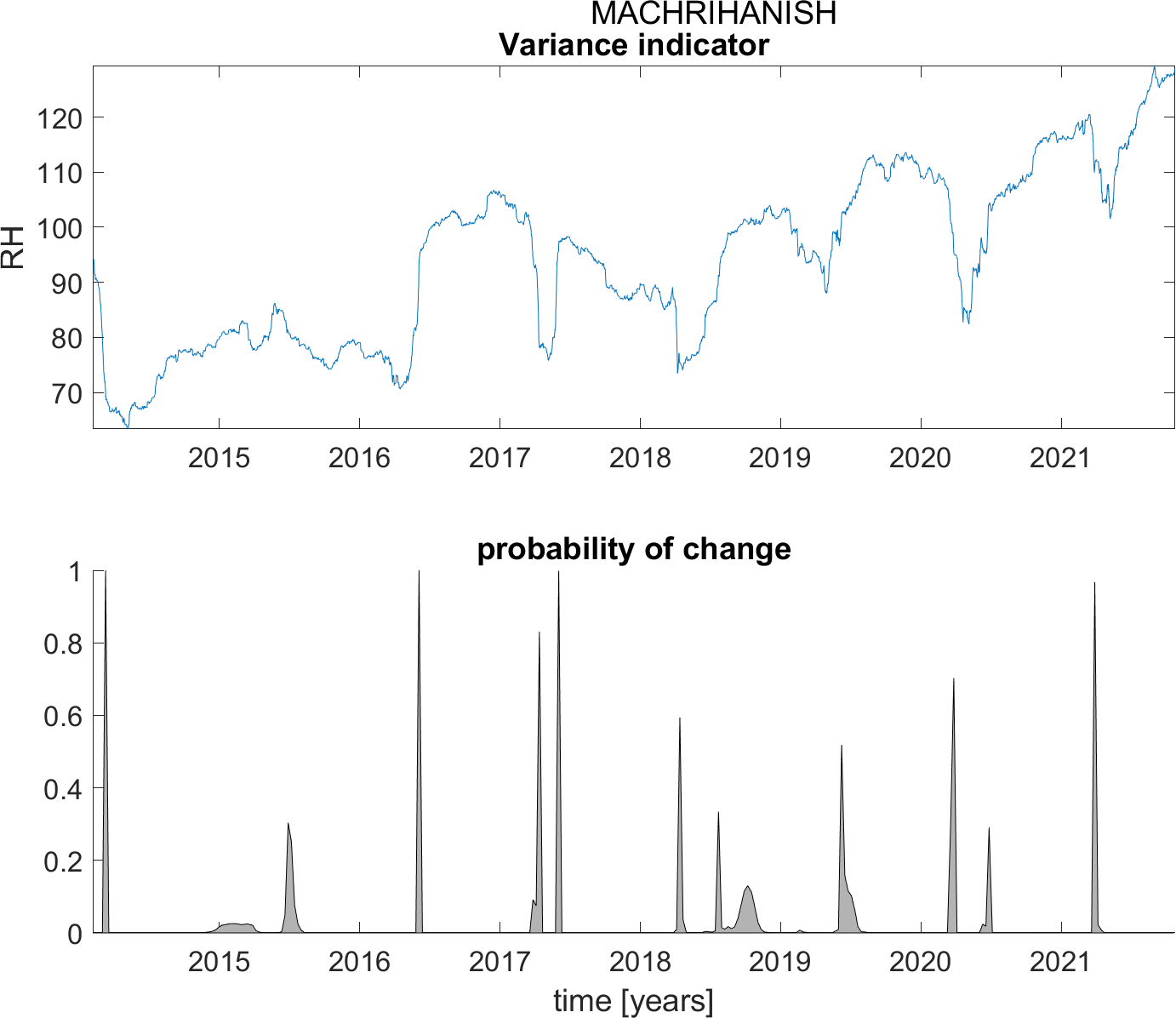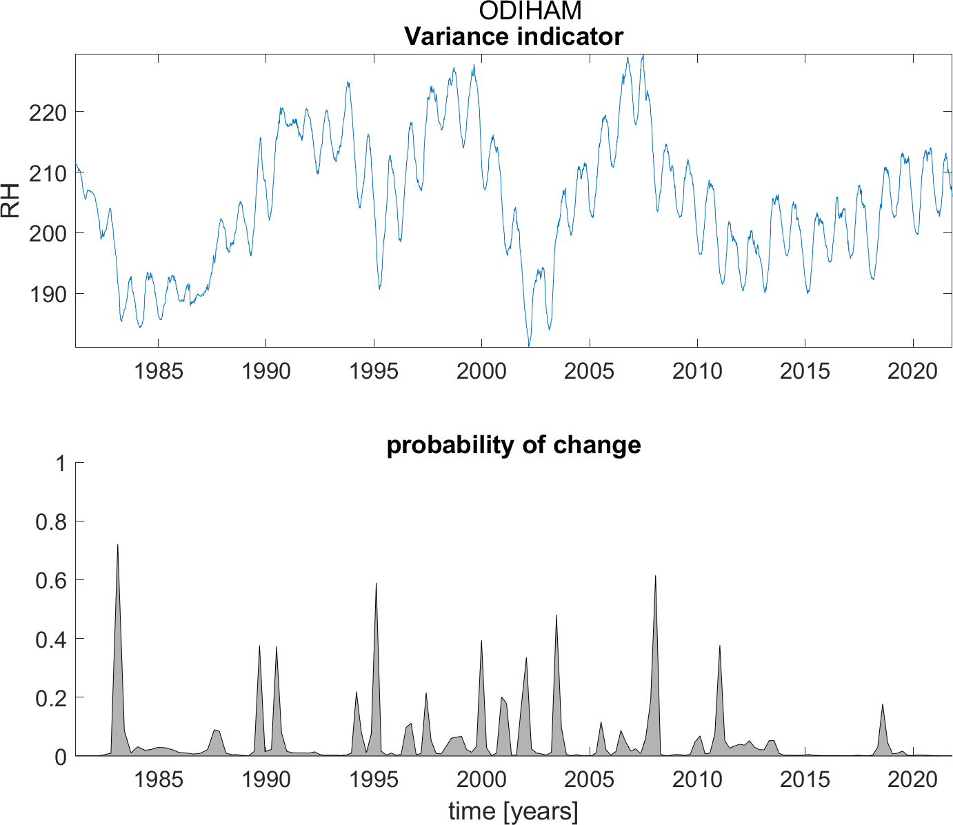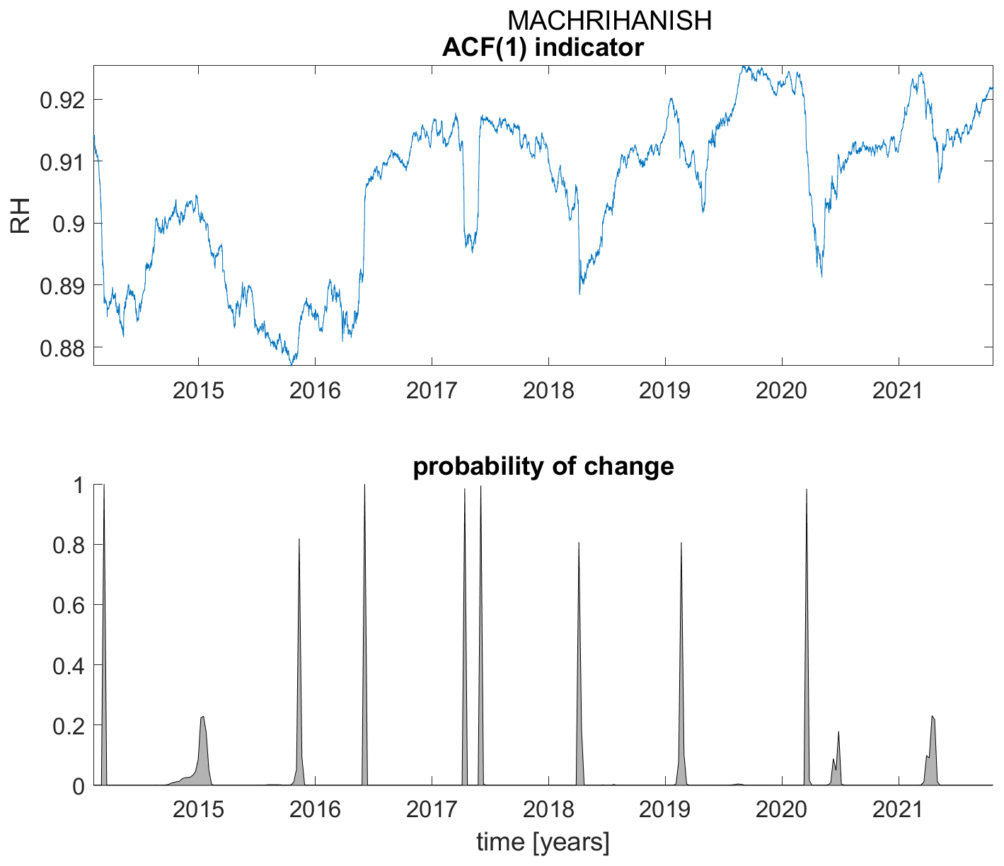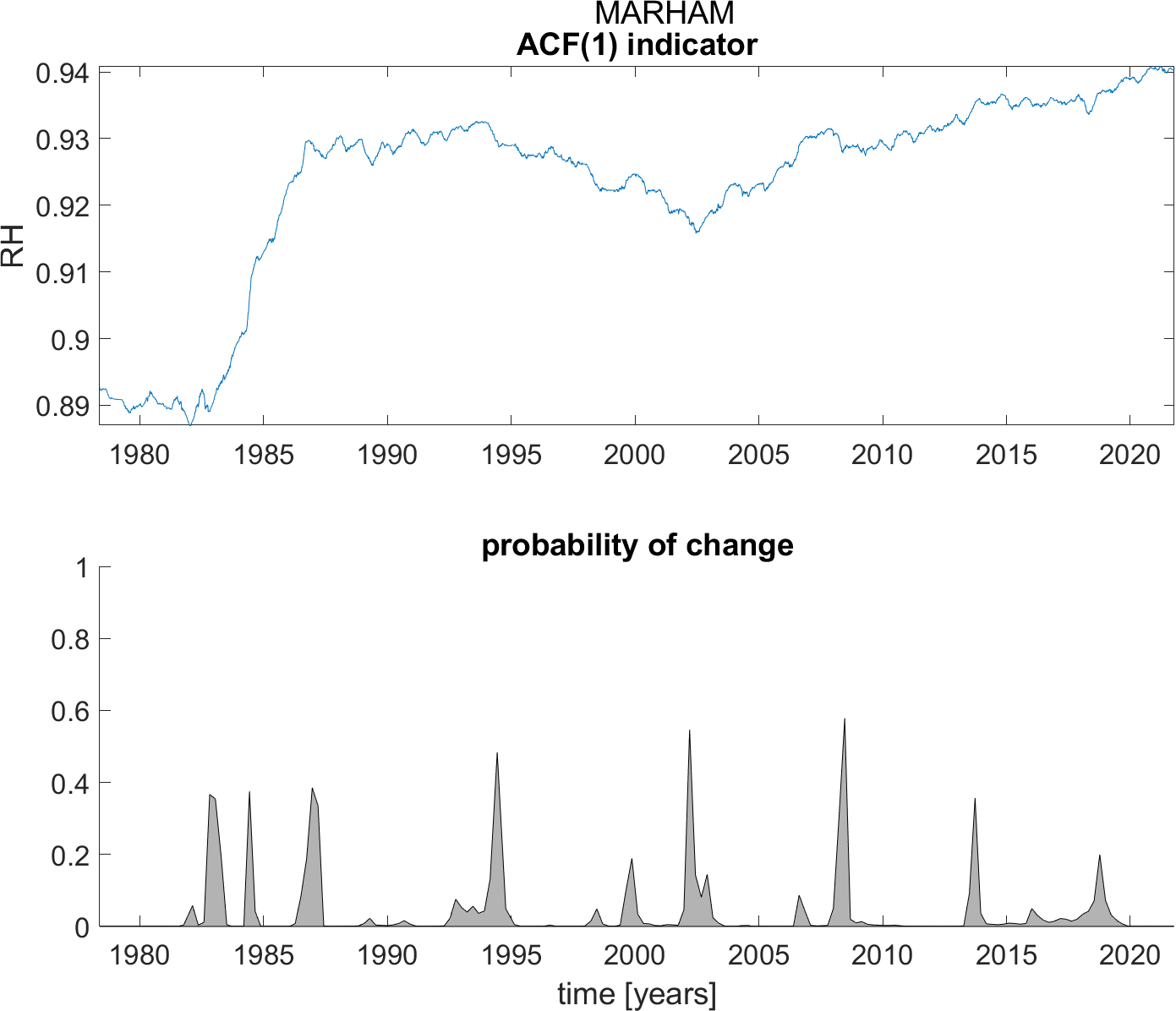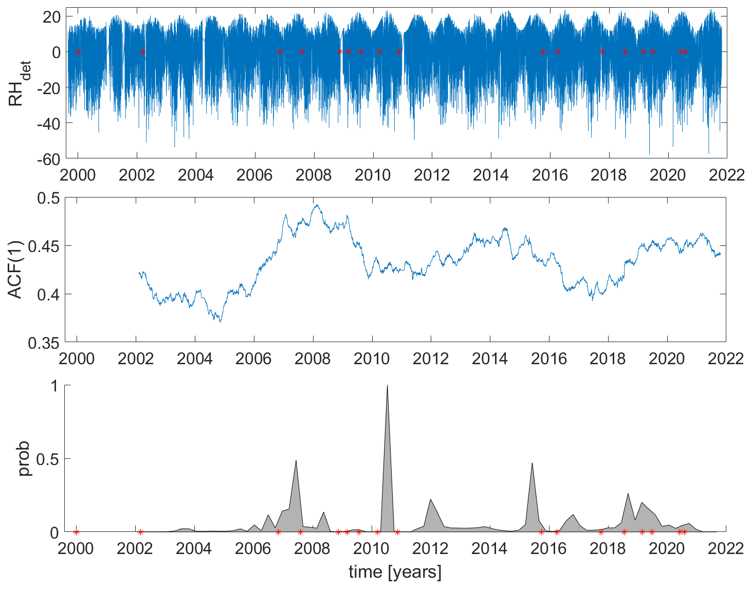 To perform automatic identification of instrumental changes, one can use probabilistic estimation of change points in the EWS indicators. By applying the Matlab package “Bayesian Changepoint Detection & Time Series Decomposition” (Zhao et al., 2019), we identify change points in EWS indicators, specifically those of statistical significance. As can be seen in the following plots, the changes in the indicators that are statistically significant can be identified in the probabilities of the changes based on the Bayesian ensembles with Monte Carlo simulations (Zhao et al., 2019). The considered variable was detrended relative humidity, for which the ACF-indicator was calculated, which then was analysed using the Bayesian model ensemble. The changes with statistically significant peaks (probability > 0.8) are narrow, and the timing of change events can be identified with small uncertainty of several weeks, if necessary.