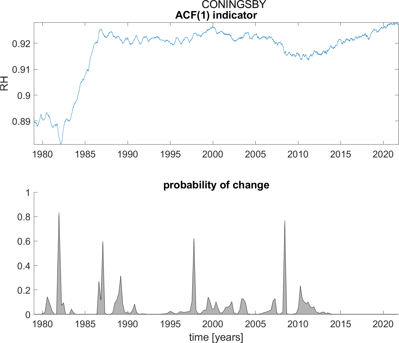 Figure A3ACF(1) indicator (upper panel) and probability of detection of changes in the ACF(1) indicator (lower panel) for station Coningsby.