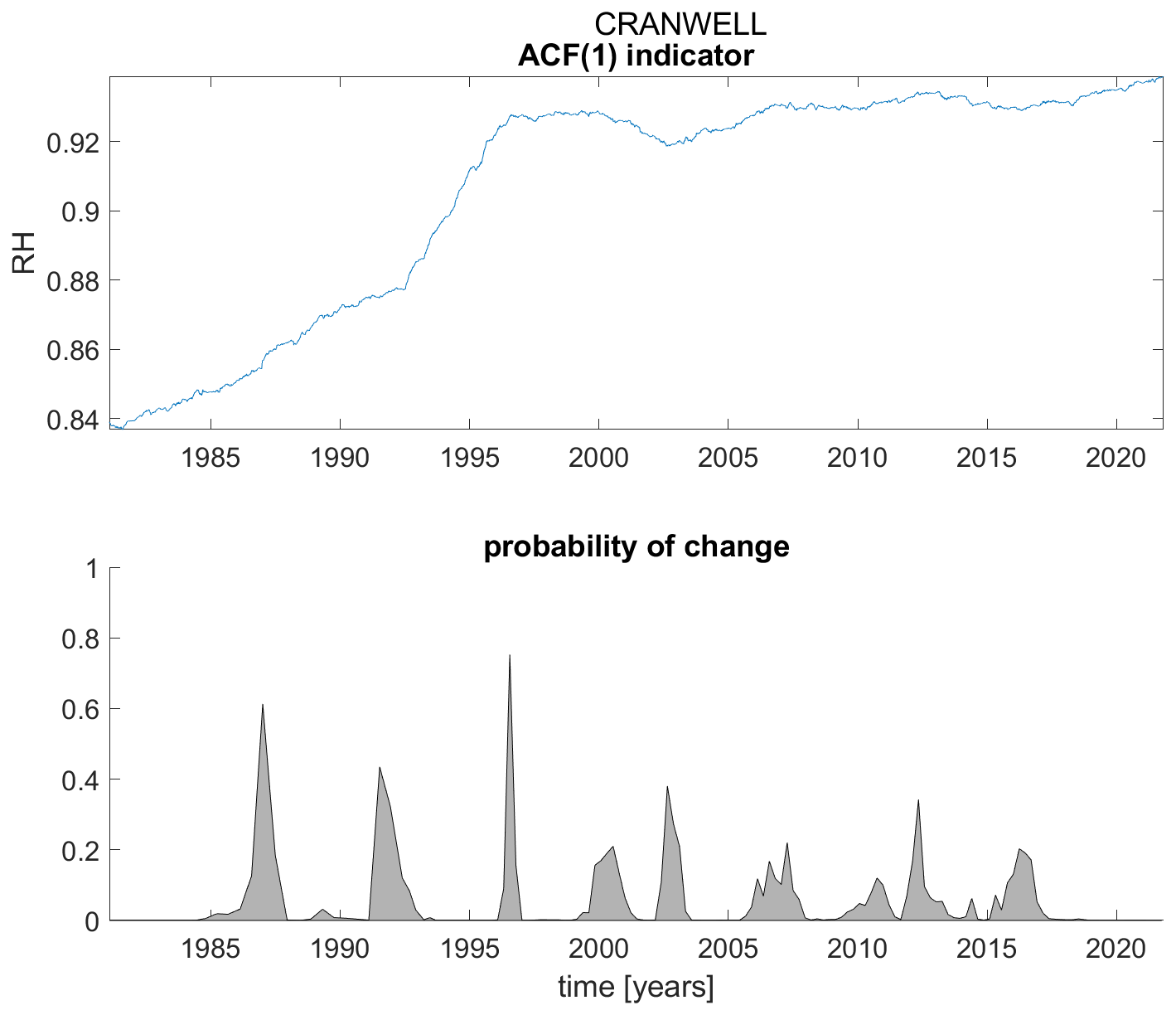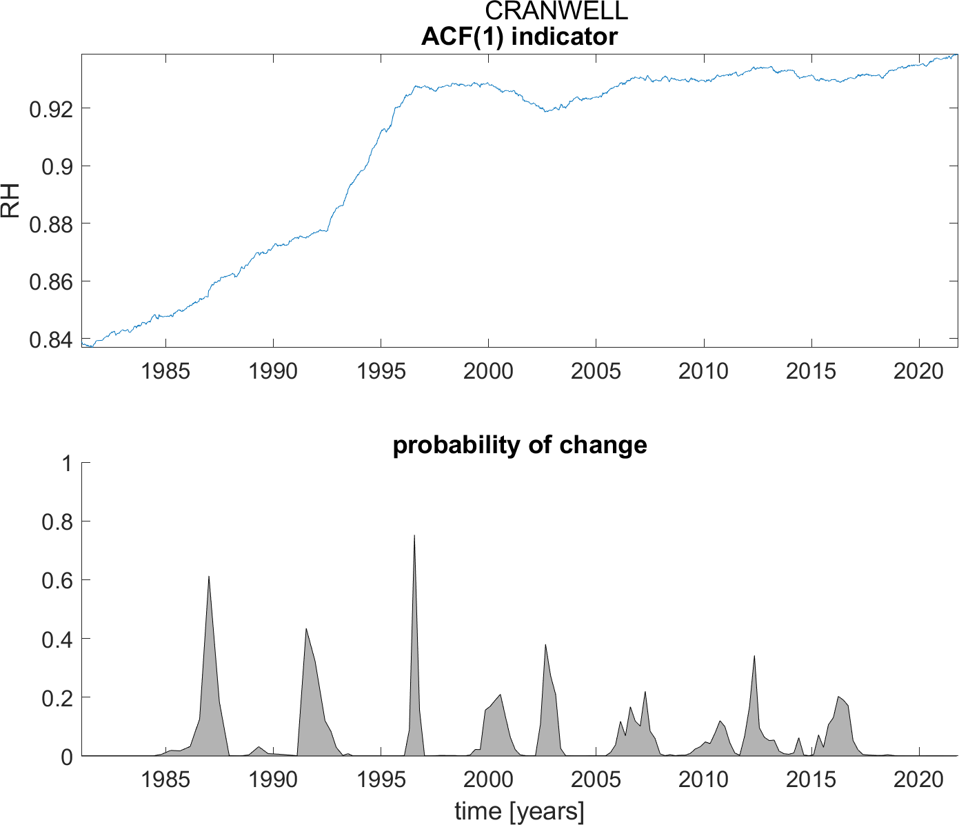 Figure A4ACF(1) indicator (upper panel) and probability of detection of changes in the ACF(1) indicator (lower panel) for station Cranwell.