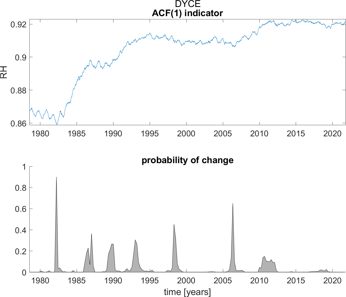 Figure A5ACF(1) indicator (upper panel) and probability of detection of changes in the ACF(1) indicator (lower panel) for station Dyce.