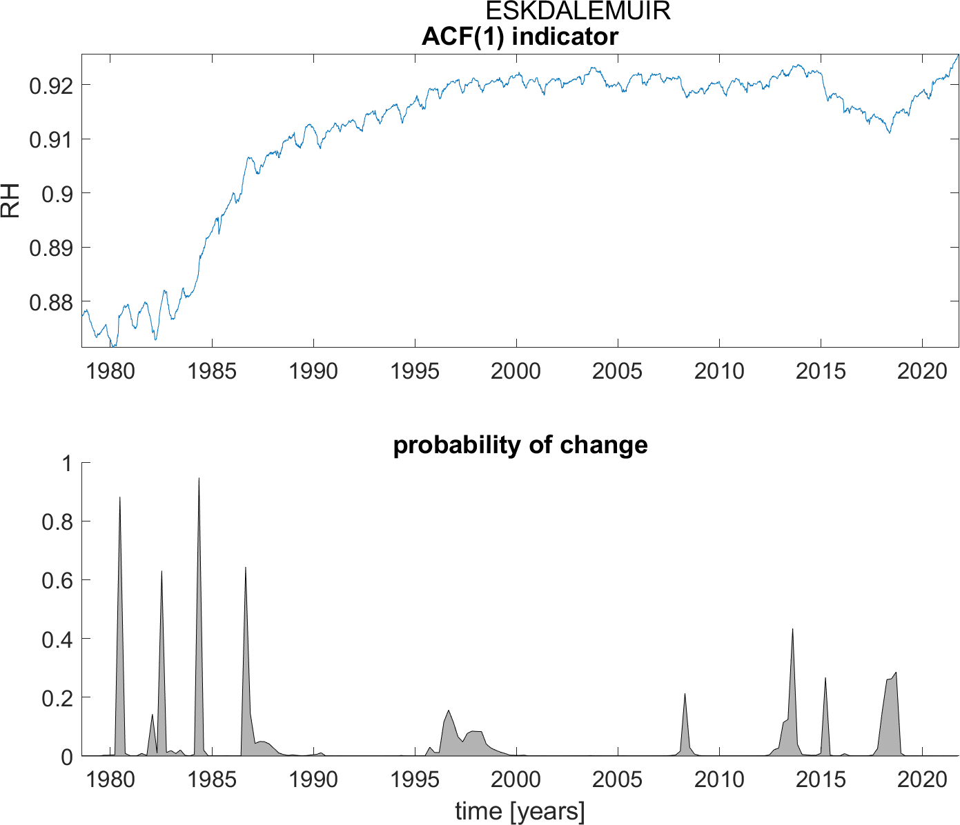 Figure A6ACF(1) indicator (upper panel) and probability of detection of changes in the ACF(1) indicator (lower panel) for station Eskdalemuir.
