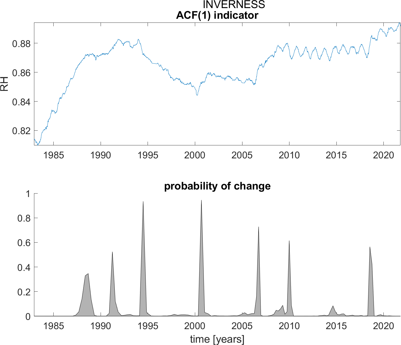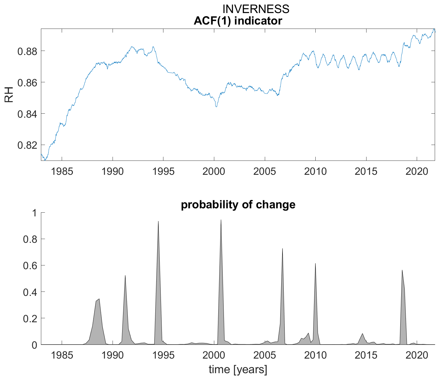 Figure A8ACF(1) indicator (upper panel) and probability of detection of changes in the ACF(1) indicator (lower panel) for station Inverness.