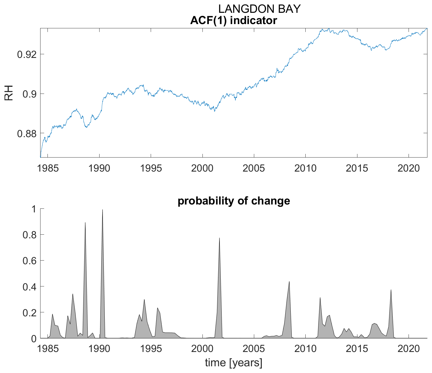 Figure A10ACF(1) indicator (upper panel) and probability of detection of changes in the ACF(1) indicator (lower panel) for station Langdon Bay.