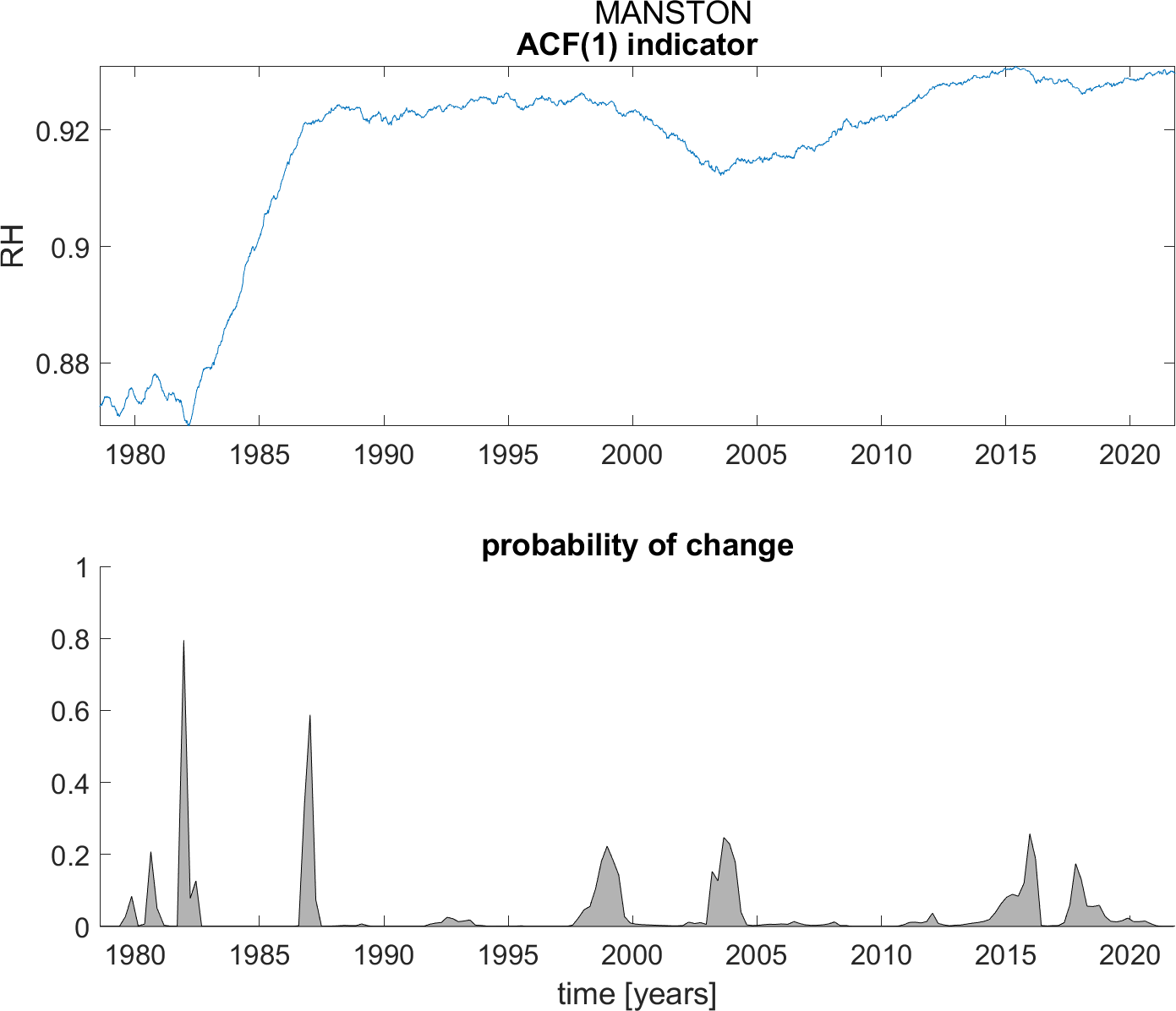 In the case of Bingley, there are two statistically significant changes, in 1994 and in 1998, which are indicated in the lower panel with probabilities of changes, see Fig. 6. The red dots in the upper panels denote the recorded changes of operations (this data was provided by Met Office for verification), for which the major changes from manual to automatic were detected by the abrupt increases in indicators. The introduced method of instrumental recording changed the patterns of autocorrelations, and this is detectable by the EWS indicators. In the later period, short intermittencies did not affect the indicators as much as the major change of the technology in the 1990s, yet many of them can be seen in the probabilistic detections in the bottom panel of Fig. 6.