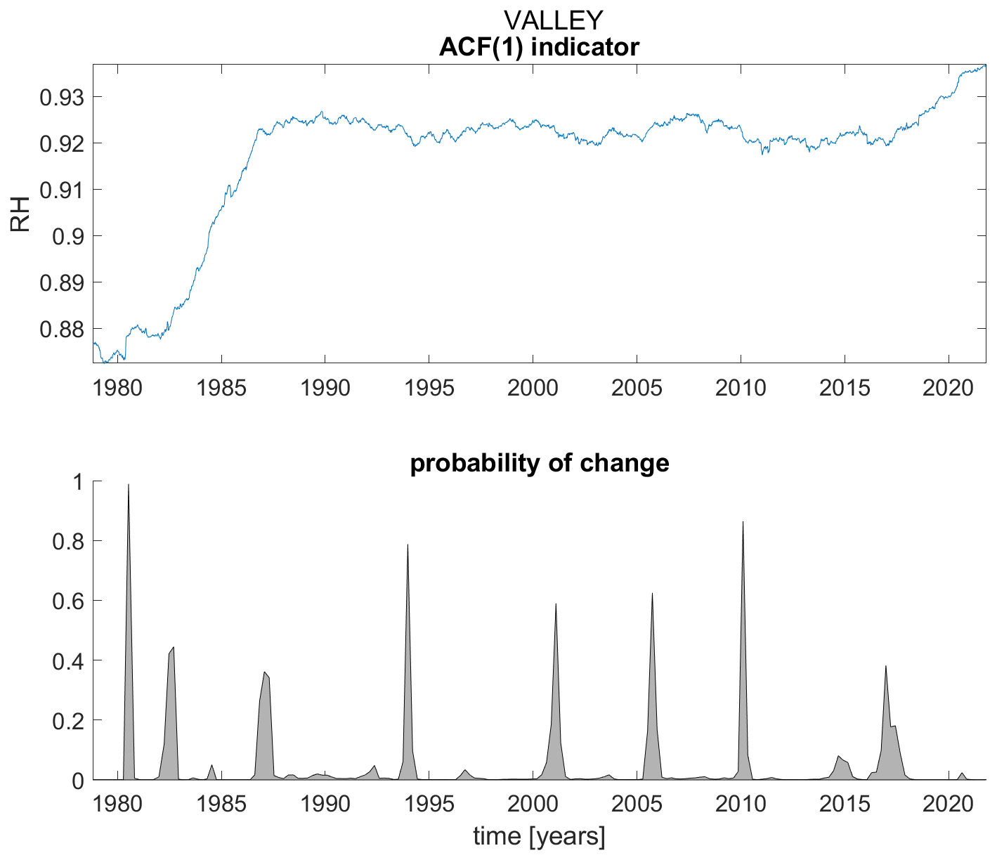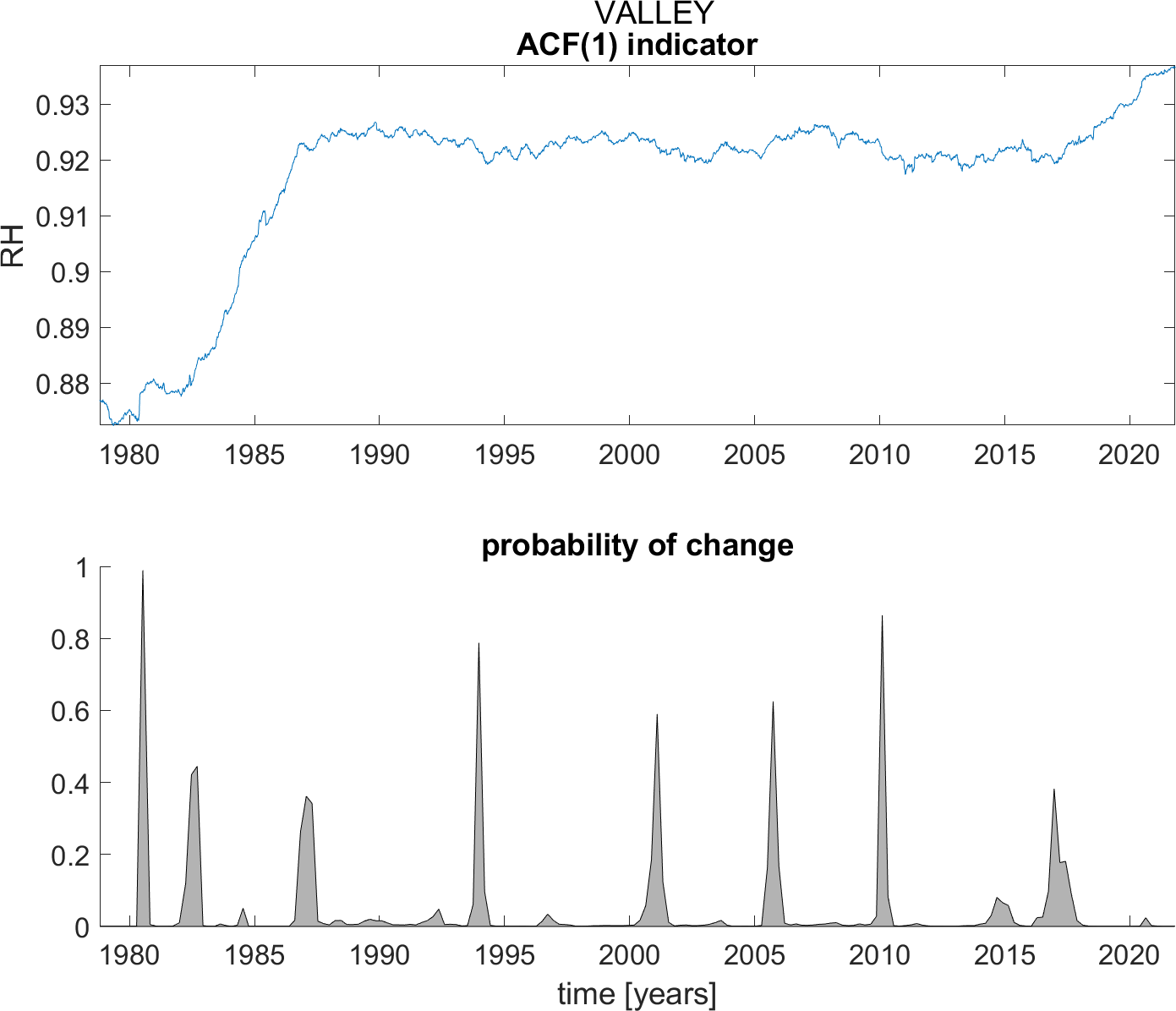 Figure A20ACF(1) indicator (upper panel) and probability of detection of changes in the ACF(1) indicator (lower panel) for station Valley.