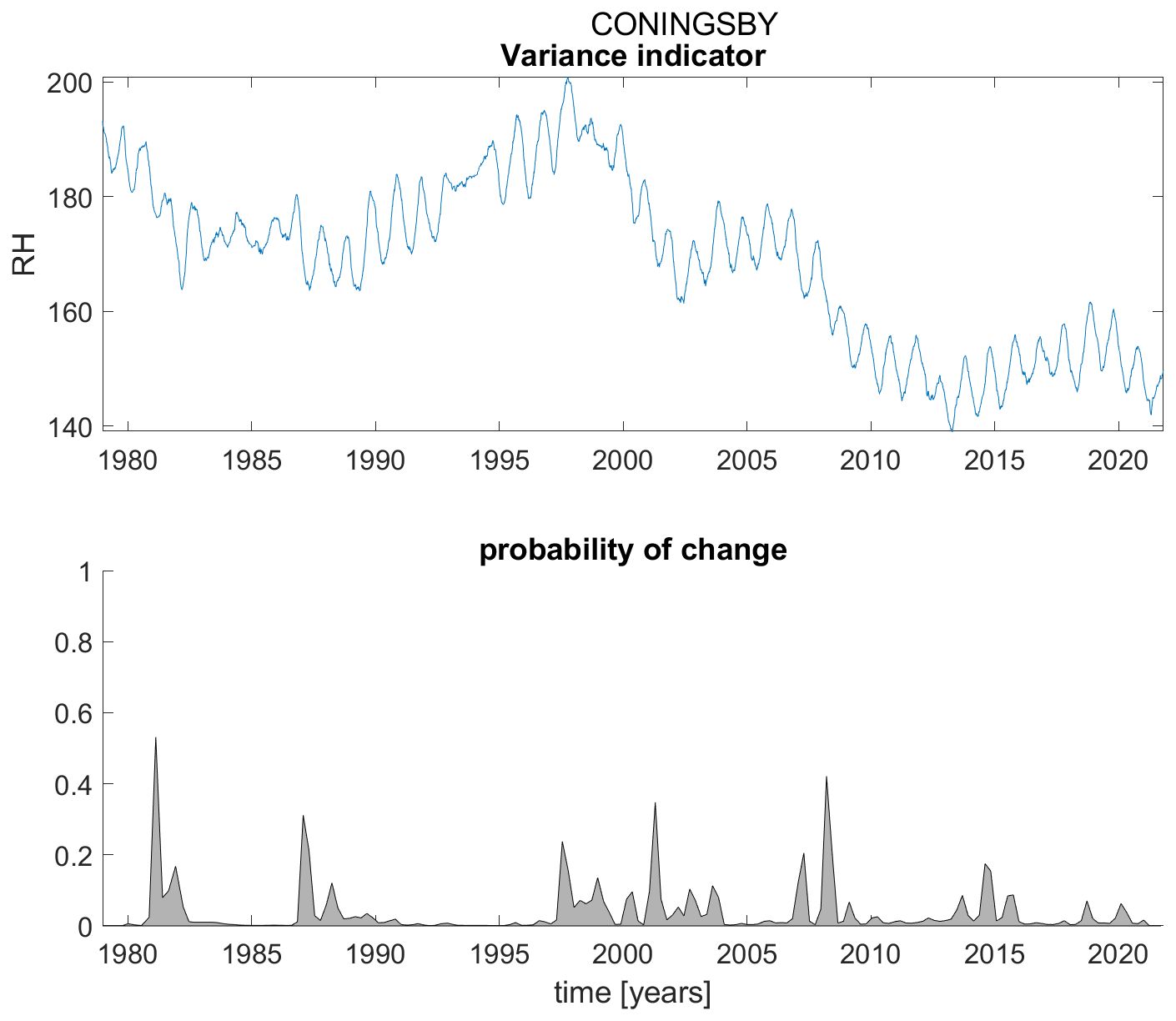 Figure B3Variance indicator (upper panel) and probability of detection of changes in the variance indicator (lower panel) for station Coningsby.