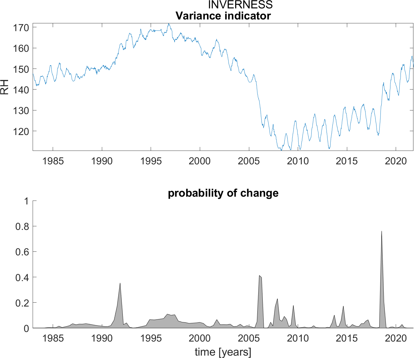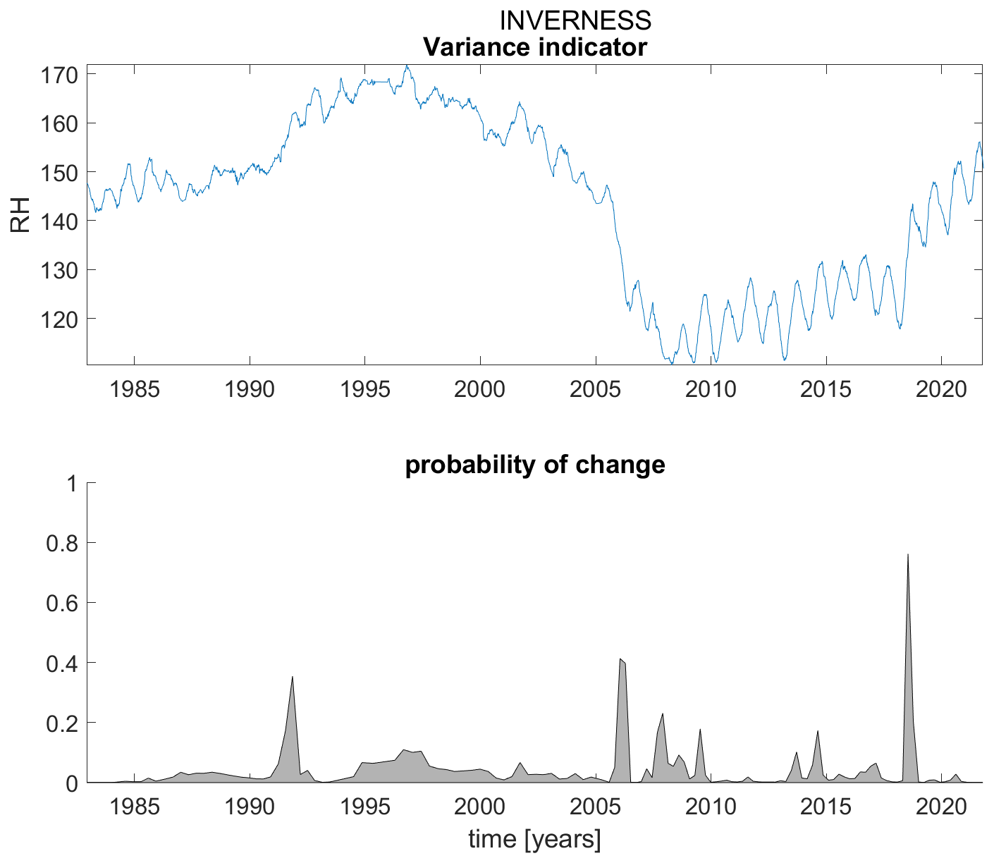 Figure B8Variance indicator (upper panel) and probability of detection of changes in the variance indicator (lower panel) for station Inverness.