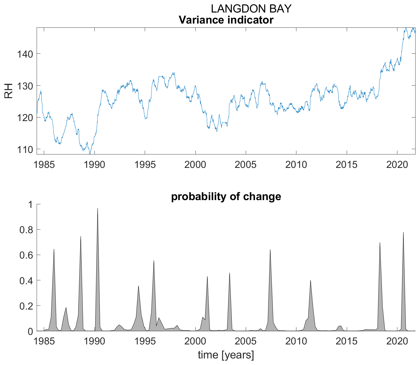 Figure B10Variance indicator (upper panel) and probability of detection of changes in the variance indicator (lower panel) for station Langdon Bay.