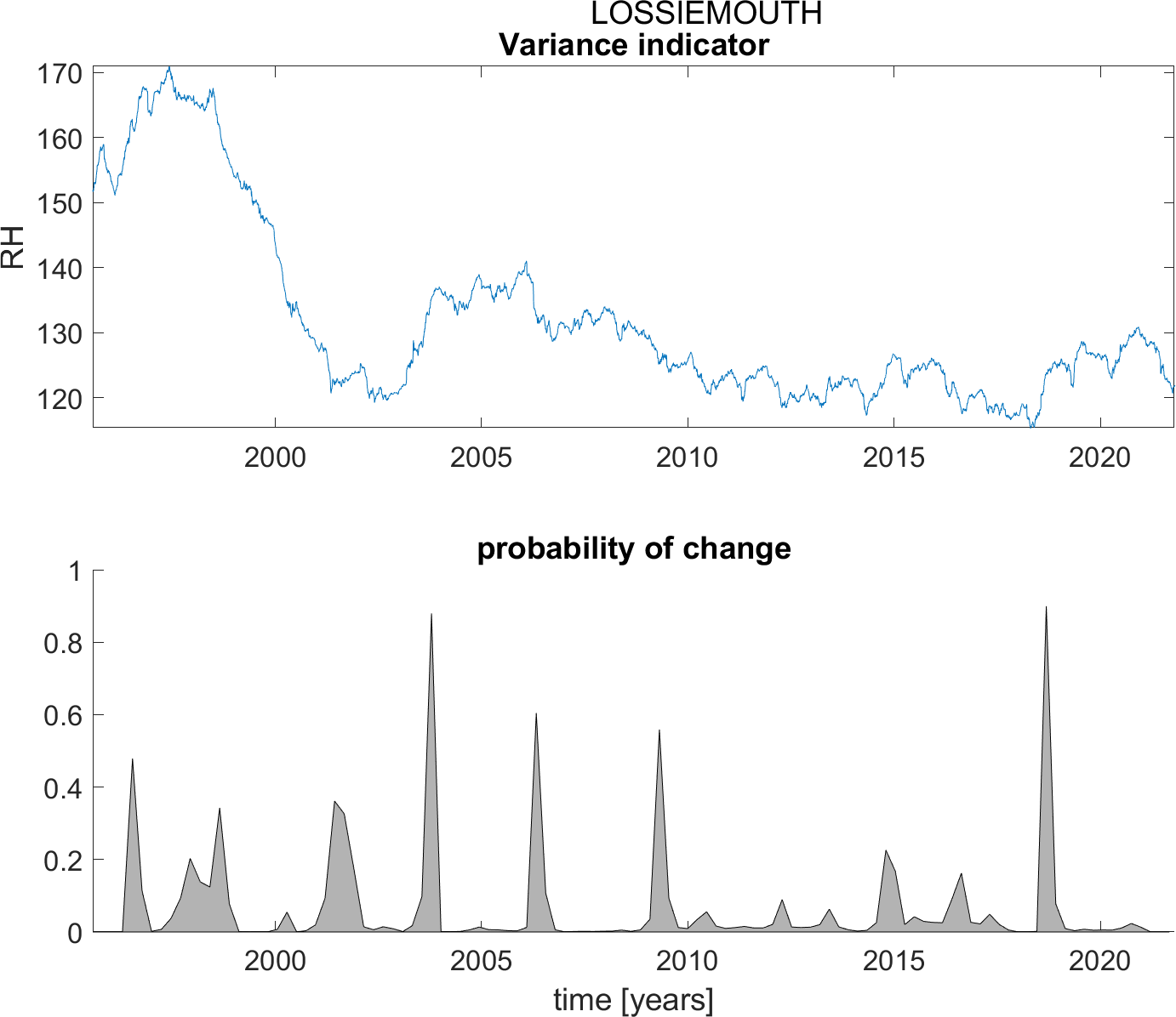 Figure B12Variance indicator (upper panel) and probability of detection of changes in the variance indicator (lower panel) for station Lossiemouth.