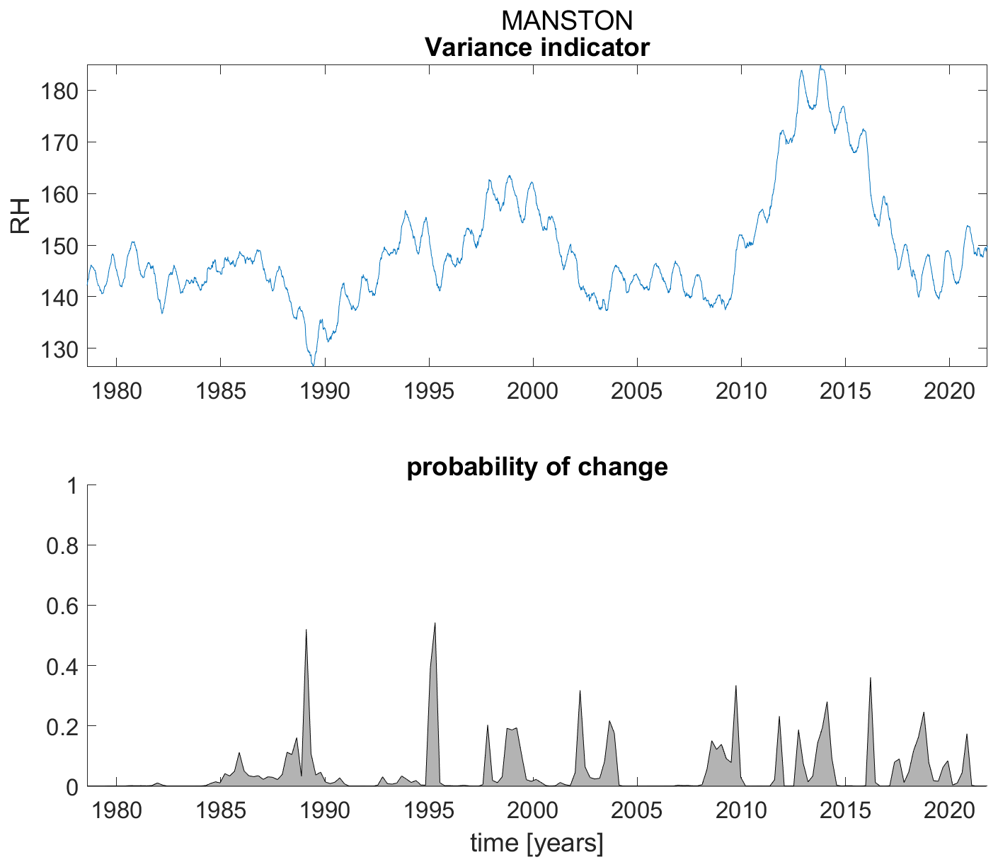 Figure B14Variance indicator (upper panel) and probability of detection of changes in the variance indicator (lower panel) for station Manston.