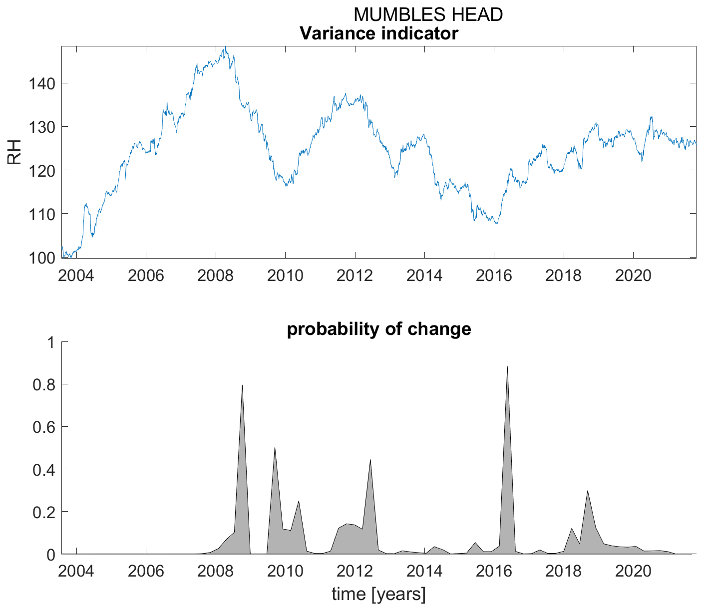 Figure B16Variance indicator (upper panel) and probability of detection of changes in the variance indicator (lower panel) for station Mumbles Head.
