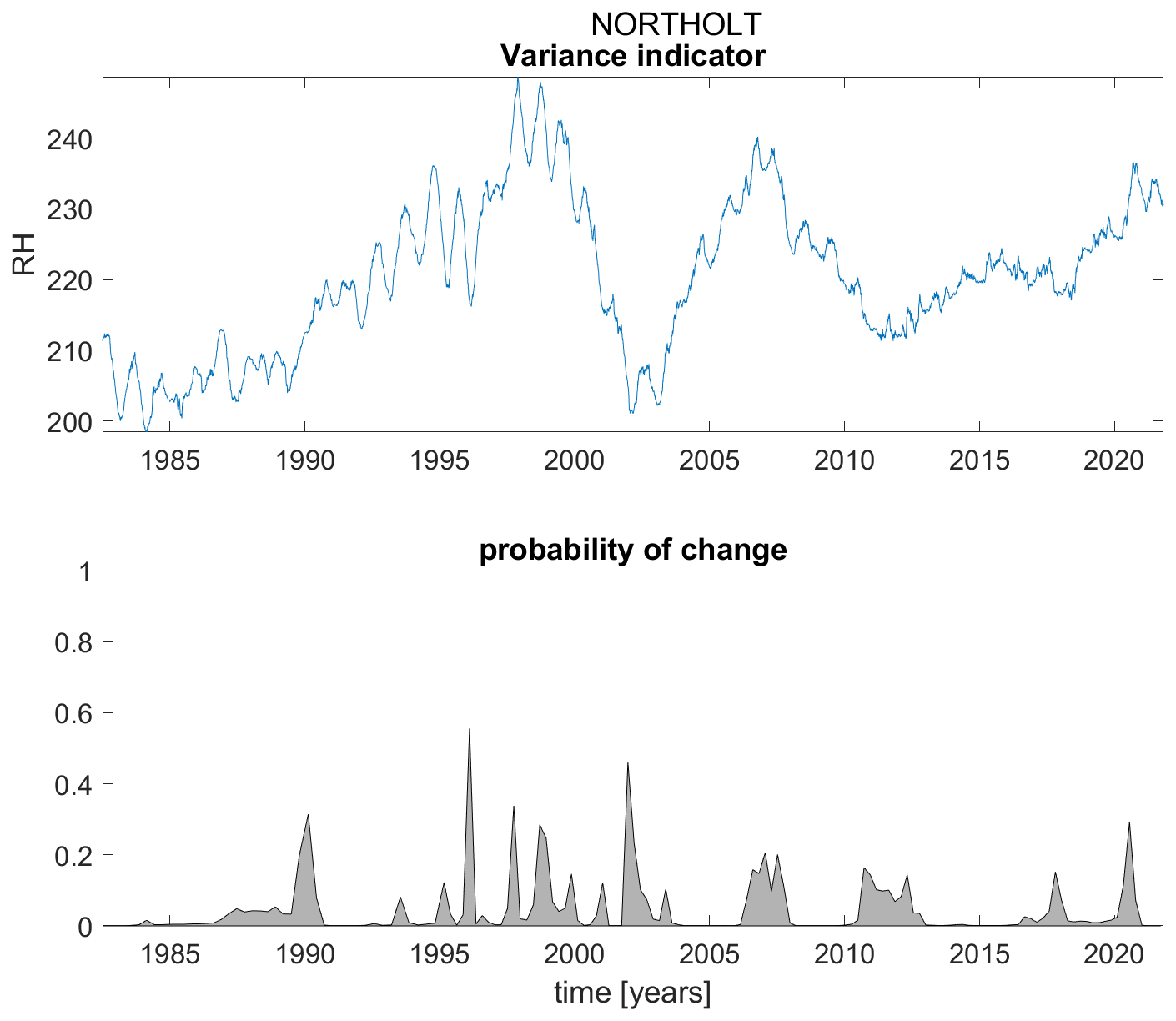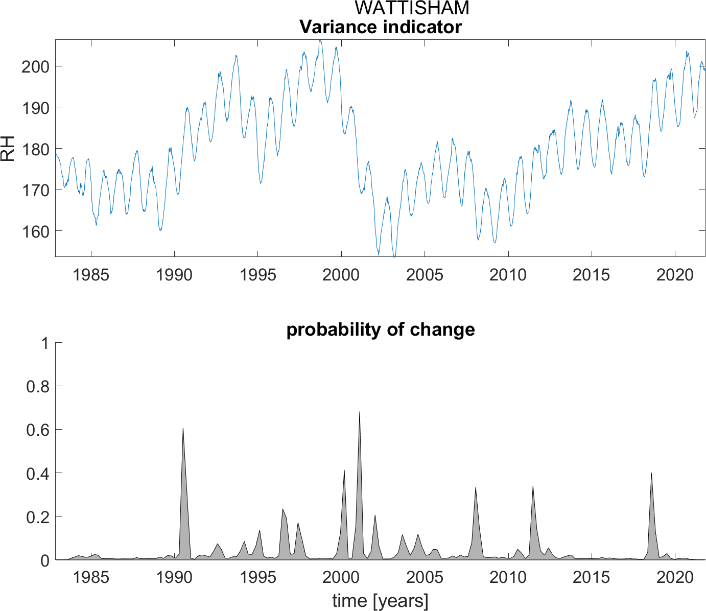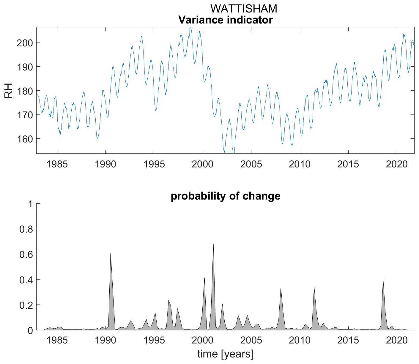 Figure B2Variance indicator (upper panel) and probability of detection of changes in the variance indicator (lower panel) for station Brize Norton.