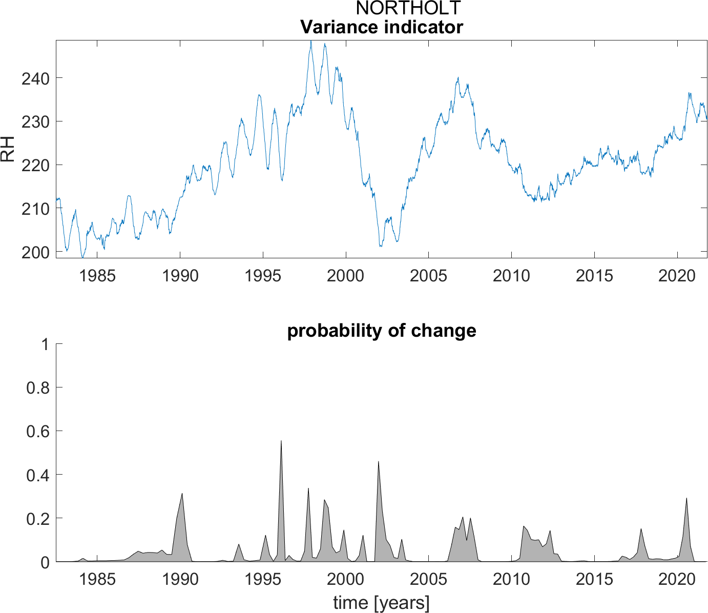 Figure B1Variance indicator (upper panel) and probability of detection of changes in the variance indicator (lower panel) for station Aldergrove.