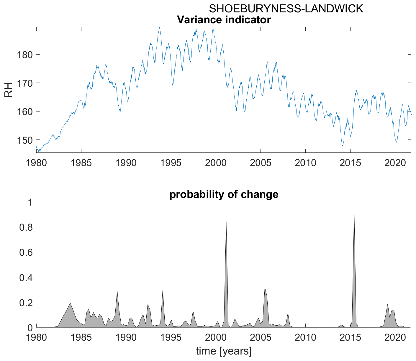 Figure B19Variance indicator (upper panel) and probability of detection of changes in the variance indicator (lower panel) for station Shoeburyness-Landwick.