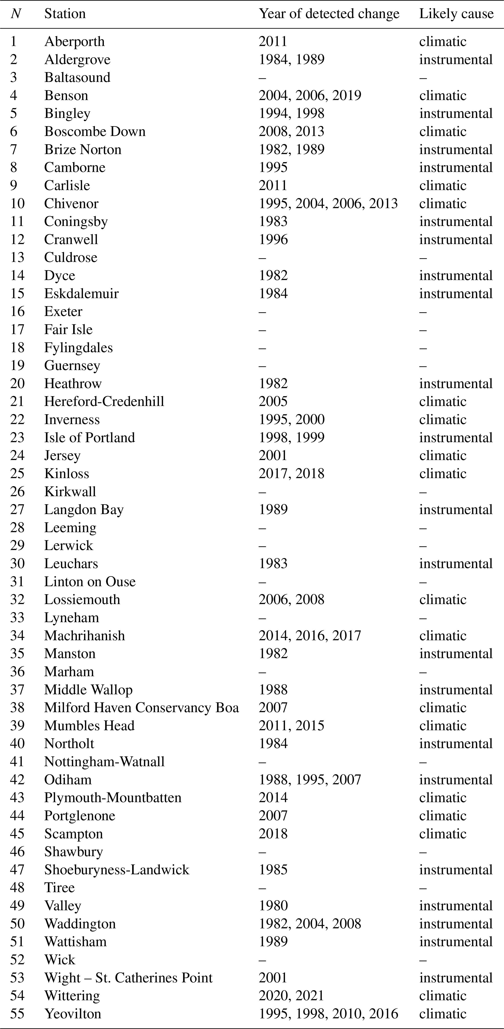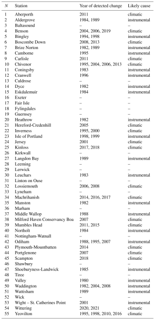 Table A1Detection of changes in the UK relative humidity records based on the detections probability above 0.8 using the Bayesian technique.