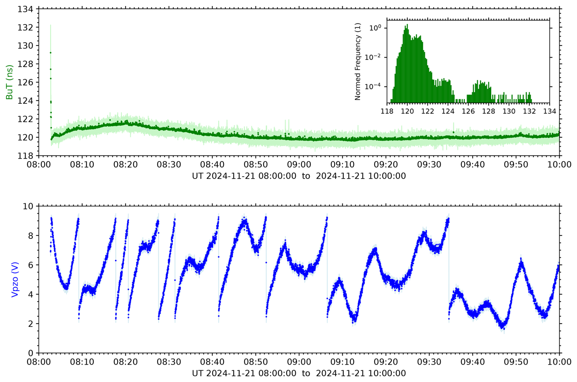Figure 2 shows the behavior of the cavity control during the first 2 operation hours of the power laser after switch-on. In the beginning, the BuT values dropped quickly from 132 to ∼ 120 ns, which corresponds to the transition to stable seeding conditions. The warm-up phase of the laser takes approx. 2 h and impacts several laser parameters, such as e.g. the cavity length. This can easily be seen in changes in the voltage controlling the piezo position, which is mostly increasing between the reset points at the limits of the piezo displacement range. During the first hour shown in Fig. 2 seven position resets occurred, indicated by voltage jumps of 7.3 V, in order to keep the cavity length constant. This corresponds to a compensation of the thermal expansion of the laser structure by ∼ 11 µm. During the next hour, the warm-up process already slowed down and only two position resets of the piezo occurred. The BuT standard deviation from ∼ 703 700 measurements during the time period of 2 h is 0.6 ns.