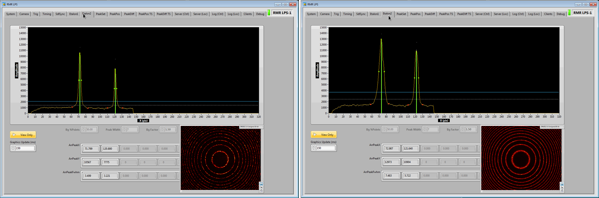 Figure 3Screenshots of the LPS client user interface. The left panel shows data from one image with seed laser light, the right panel the same for one power laser pulse. Red circles are interference ring patterns as detected by the camera. Peak parameters are calculated from cross sections of the inner two rings. For details see text.