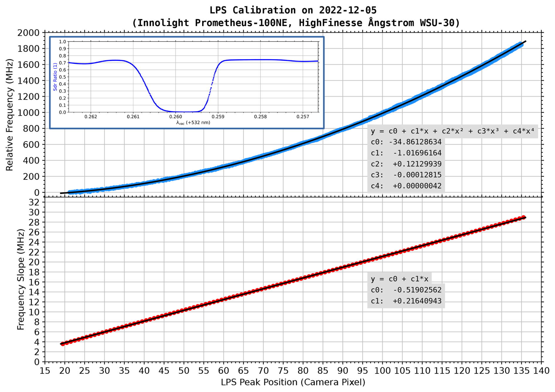 In the setup for the stabilization of the seed laser, 532 nm radiation is guided through an iodine vapor cell and the light intensity is determined before and behind the cell (Fiedler and Baumgarten, 2024). The ratio of these intensities (behind / before) is a measure of the absorption. The LPS was calibrated by tuning the wavelength of the seed laser over a part of the iodine absorption spectrum around line 1109. During this procedure the position changes of the inner two peaks of the interference ring patterns were followed. At the same time the absolute wavelength of the seed laser was monitored using a commercial wavelength meter Ångstrom WSU-30 (HighFinesse GmbH) having an accuracy of 30 MHz. The scan covered ∼ 6 GHz as indicated by the wavelength meter, corresponding to approx. six free spectral ranges of the etalon as indicated by the interference patterns acquired by the LPS. During each cycle, corresponding to one free spectral range, the innermost peak moved roughly from pixel position 20 to 100 and the adjacent peak from pixel position 100 to 135 on the camera. Data from all six cycles were merged to obtain a mean relationship between camera pixel position and relative frequency. The result is the continuous mapping of ring radii to relative frequency, with the range in pixel position 20 to 135 corresponding to a change in frequency of ∼ 1.8 GHz.
