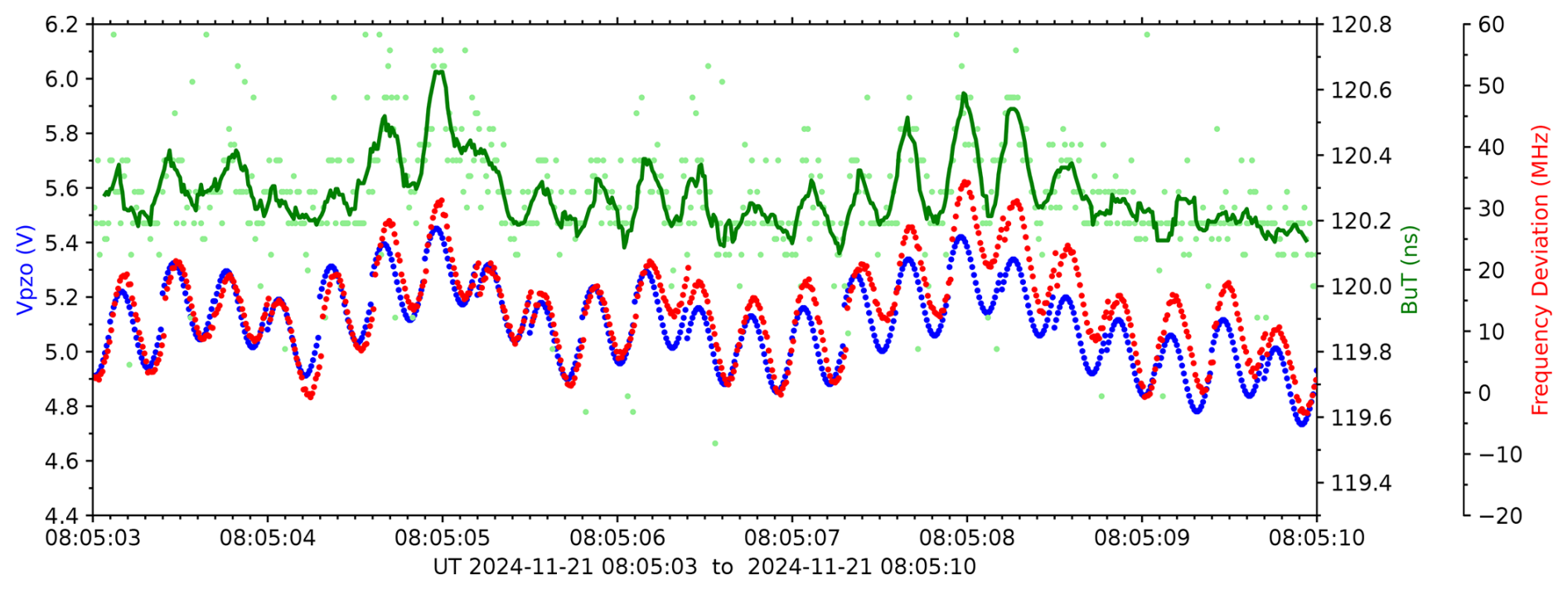 Figure 6FCaM performance during a time period of 7 s (700 measurements for each parameter): piezo voltage controlling the cavity length (Vpzo, blue), build-up time (BuT, green), and frequency deviation between power and seed lasers (red). Single values are drawn as points, the running mean as line.