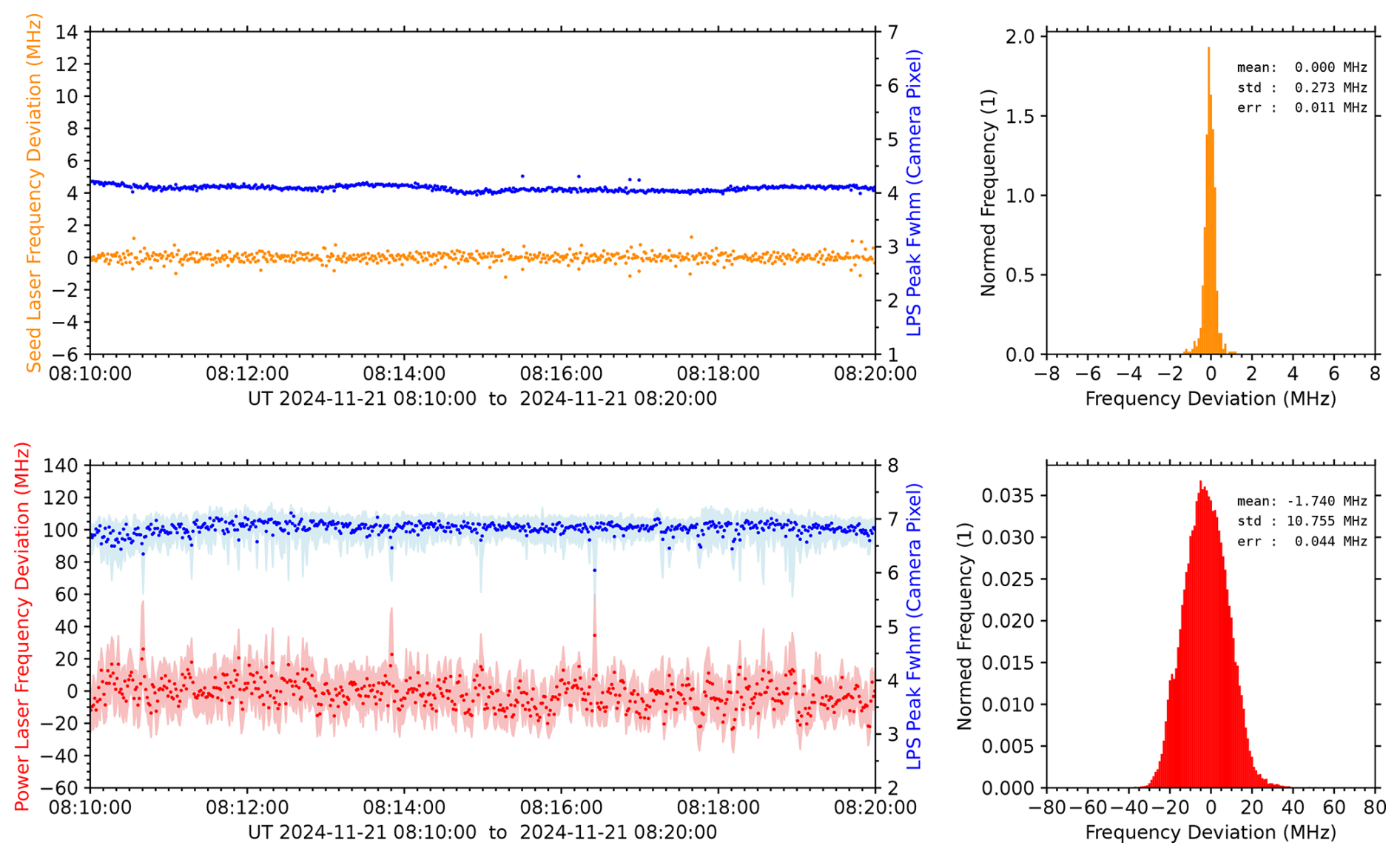 Figure 7Frequency stability of the lasers during a time period of 10 min, corresponding to 600 seed laser (upper panels, orange) and 60 000 power laser (lower panels, red) measurements. The points are mean values over 1 s, minima and maxima during these periods are shown in light color. The histograms contain all individual values for the frequency deviations and the corresponding statistical mean, standard deviation, and standard error. The full widths at half maximum of the interference ring patterns on the camera are also shown in blue (Peak Fwhm). Please note that the axis scalings for power and seed laser frequency deviations differ by one order of magnitude.