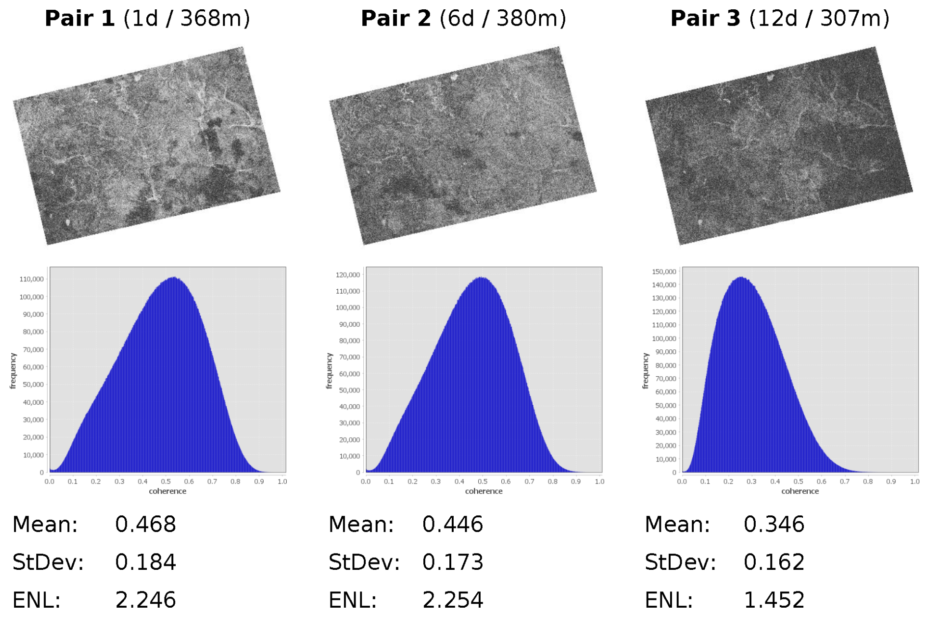 In a first step, interferometric coherence is computed as the magnitude of the normalized complex cross-correlation between two co-registered SAR SLC images over a local window. It quantifies the stability of the scattering phase between the acquisitions and ranges from 0 (no correlation) to 1 (perfect stability), and therefore serves as an early indicator for the final DEM quality of each pair (Martone et al., 2012). Figure 2 shows the coherence maps retrieved from the three image pairs as well as their histograms and raster statistics. The maps show bright areas with high coherence especially for pair 1 (Btemp 1 d) in areas with less vegetation cover, mainly along the river stream and an average of 0.468 over the entire image. In comparison, strong coherence is less frequent and less spatially connected in pair 2 (Btemp 6 d) and also slightly lower at average (mean 0.466), although their histograms are widely identical. A strong decrease can be observed between pair 2 and pair 3 (Btemp 12 d) which is largely decorrelated except for areas in the center (mean 0.346). This shows the impact of temporal decorrelation over vegetation which is a common problem in radar interferometry (Zebker and Villasenor, 1992). As a supplementary robustness indicator, the equivalent number of looks (ENL) is calculated and considered, which describes the effective number of independent looks and thus the variance reduction through multi-looking (Jong-Sen Lee et al., 1994). Accordingly, a higher ENL represents lower estimation variance (Gierull and Sikaneta, 2002). The ENL is almost identical for pair 1 (2.246) and pair 2 (2.254), but drops to 1.452 for pair 3, indicating significantly poorer phase estimation precision at 12 d. Overall, the coherence analysis supports the expectation that a 1 d repeat provides noticeably more favorable conditions for height derivation while temporal decorrelation predominates with the pair of 12 d. Coherence is analyzed at more detail in Sect. 3.5 and 3.6.