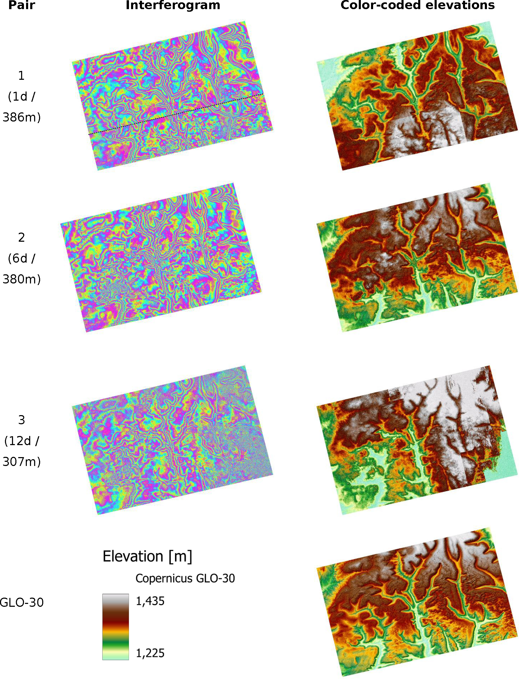 Figure 3Interferograms (left) and resulting digital elevation model (right) for the three image pairs. Copernicus 30 m Elevation Model (GLO-30) for visual reference.