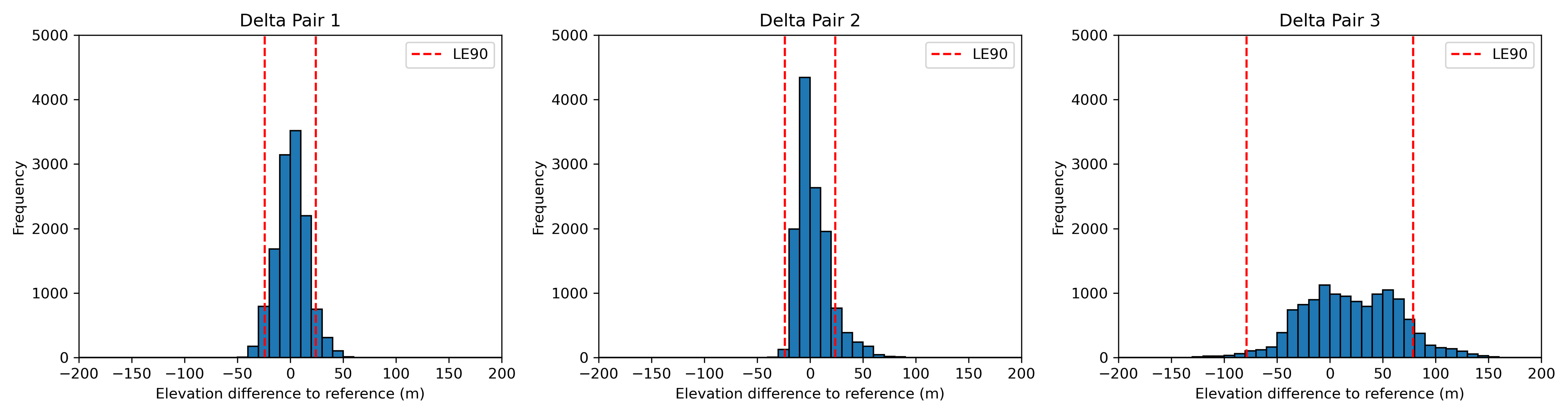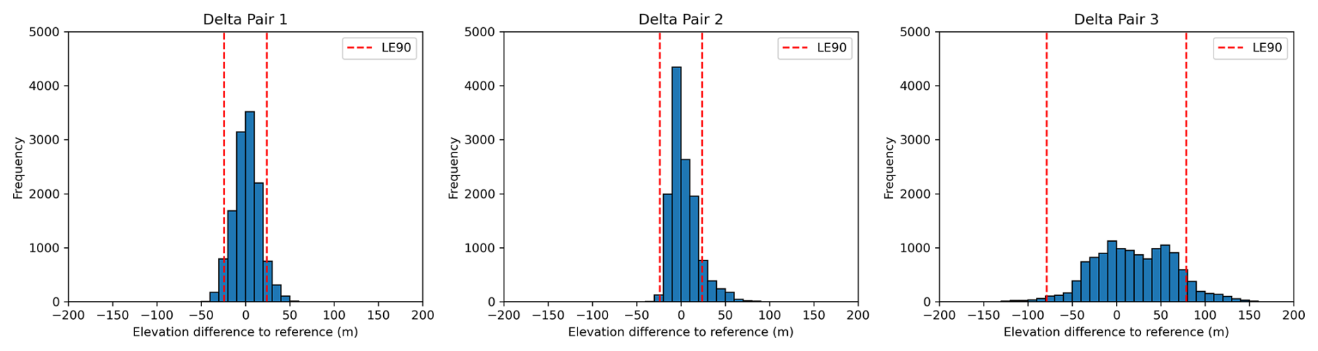 Mean Bias (Eq. 4): The arithmetic mean of the elevation differences. Indicates whether the DEM has a systematic tendency to overestimate or underestimate elevations relative to the reference. Its range is indicated by red dashed lines in Fig. 4 which displays histograms of the error (Δi) of the DEMs from the three image pairs.