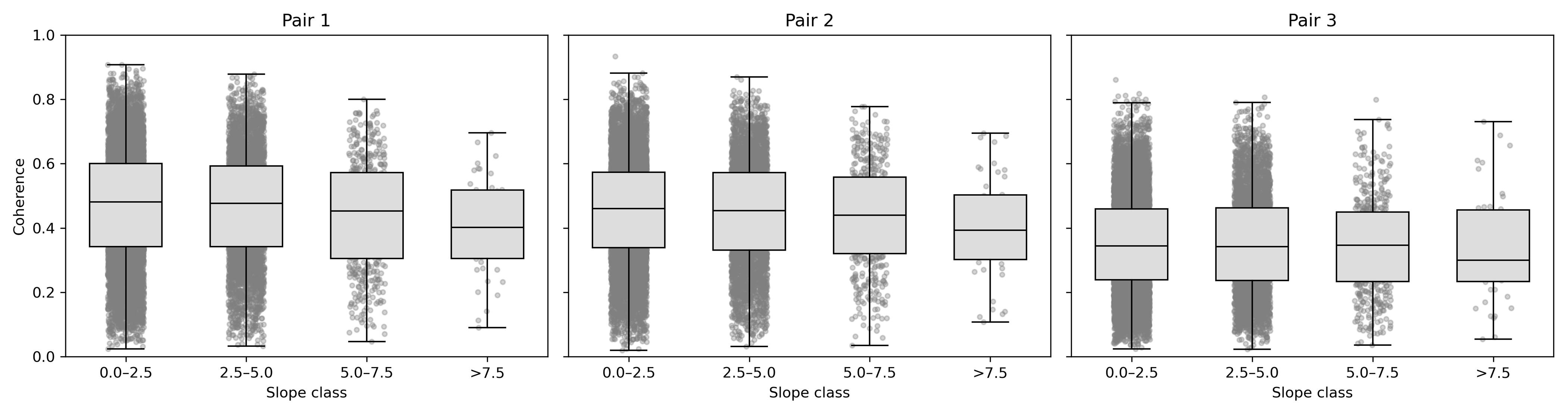 Terrain slope was computed based on the GLO-30 DEM and added to all sample points used in the previous sections to analyze if topography has an impact on coherence and height errors. As large proportions of the study area are predominantly flat (see Fig. 3) and only small factions show high slope angles, four classes (0–2.5°, 2.5–5°, 5–7.5°, and >7.5°) were defined for this analysis. Figure 5 shows box plots of coherence values of all three analyzed image pairs grouped by the defined slope classes.