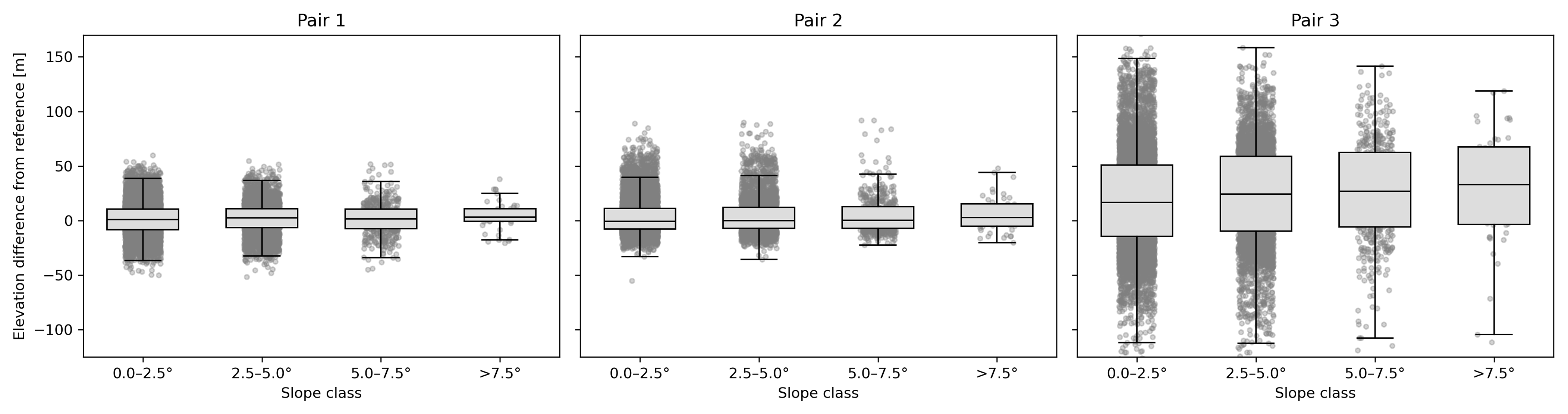 In a next step, the elevation differences (Sect. 3.3) were disaggregated by the defined slope classes and plotted as shown in Fig. 6. Similar to the coherence statistics, the lowest slope class appears to contain the largest variance at first glance, but this can again be attributed to the larger sample size in flat terrain (n=8338). Median elevation differences lie around 0 m through all classes, and interquartile ranges (IQR; representing the center 50 % of all sampled elevation differences) are nearly identical across the first three classes, ranging from around −5 to around +10 m. Also, the whiskers, representing the 5 % and 95 % percentiles, have largely similar ranges from around −22 to +25 m. The class with the highest slopes (>7.5°) seems aligned with these numbers but should be interpreted with care due to the small number of samples (n=46). For pair 2 (Btemp 6 d), positive deviations occur more frequently as compared to pair 1 (Btemp 1 d), yet the median height error remains within −1 and +1 m in all classes. Whisker lengths are comparable to pair 1, indicating robust, largely relief-independent accuracy. For pair 3 (Btemp 12 d), the distributions broaden markedly, with IQR roughly from −10 to +50 m and clearly longer whiskers. Occasional outliers appear, particularly at steeper slopes, pointing to a notable loss of elevation quality as consequences of local layover and shadow effects. Overall, no systematic median bias across slope classes for pair 2 can be identified, indicating comparable quality for pairs 1 and 2 (Btemp 1 and 6 d), while accuracy primarily degrades between 6 and 12 d. The predominance of gentle slopes strengthens the statistical reliability of the first two classes, whereas conclusions for >7.5° remain tentative due to small sample sizes. Accordingly, the deterioration at pair 3 (Btemp 12 d) could be interpreted as the combined effect of increased phase noise and higher unwrapping susceptibility in complex terrain, which broadens the error distributions. This pattern is consistent with coherence analysis and underscores the value of short repeat intervals for high-quality DEM generation.