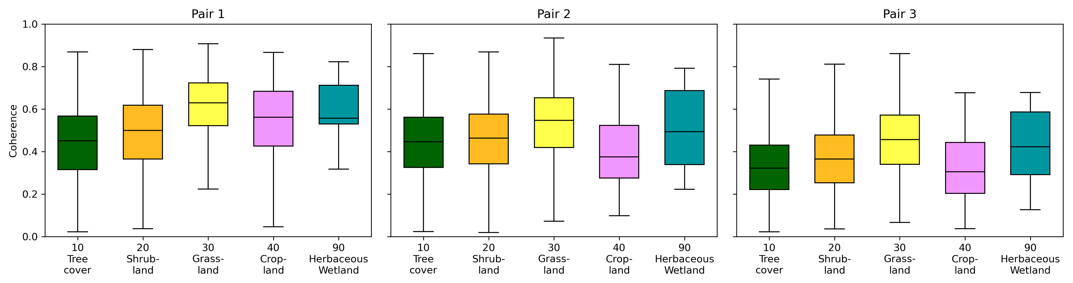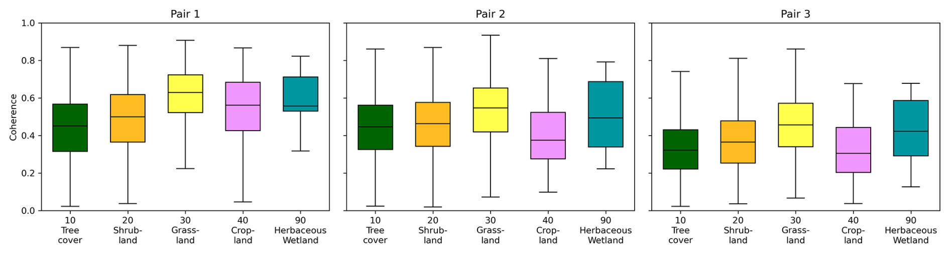 To assess if land cover, which is strongly linked to different backscatter mechanisms of surfaces, affects the quality of interferometric radar products, both coherence height errors were overlaid with land cover classes at the sample points. These were retrieved from the ESA WorldCover dataset (Zanaga et al., 2022). Figure 7 shows boxplots of coherence for all three image pairs grouped by the main classes (Tree Cover, Shrubland, Grassland, Cropland, Herbaceous Wetland). The overall trend from Sect. 3.1 is confirmed: coherence decreases with increasing temporal baseline across nearly all classes. Throughout all classes, Tree Cover exhibits the lowest coherence (0.45, 0.44, 0.36) because of the large proportions of volume decorrelation (Kellndorfer et al., 2022) while Grassland contains the highest medians (0.64, 0.54, 0.45) as a result of surface scattering dominance (Stiles et al., 2000). All other classes show indifferent statistics over the three analyzed pairs. All classes have the highest coherence in pair 1 (Btemp 1 d), with median values above 0.5 except for Tree Cover. In contrast, coherence in pair 2 (Btemp 6 d) drops markedly for the classes Cropland and Herbaceous Wetland because temporal decorrelation occurs already within a few days (Mestre-Quereda et al., 2020). Grassland declines moderately and Tree Cover remains low and largely unchanged, consistent with pre-existing volume decorrelation. For pair 3 (Btemp 12 d) median coherence falls below 0.4 in all classes with Tree Cover decreasing further and Cropland becoming the lowest coherence class. Grassland retains the highest coherence in comparison but remains well below its pair 1-level. These observations align well with expectations from volumetric and temporal decorrelation: forested and agricultural surfaces decorrelate more strongly than grasslands (Kellndorfer et al., 2022). The transition from 6–12 d produces a cross-class drop in coherence that is evident even in structurally simpler surfaces such as Grassland.