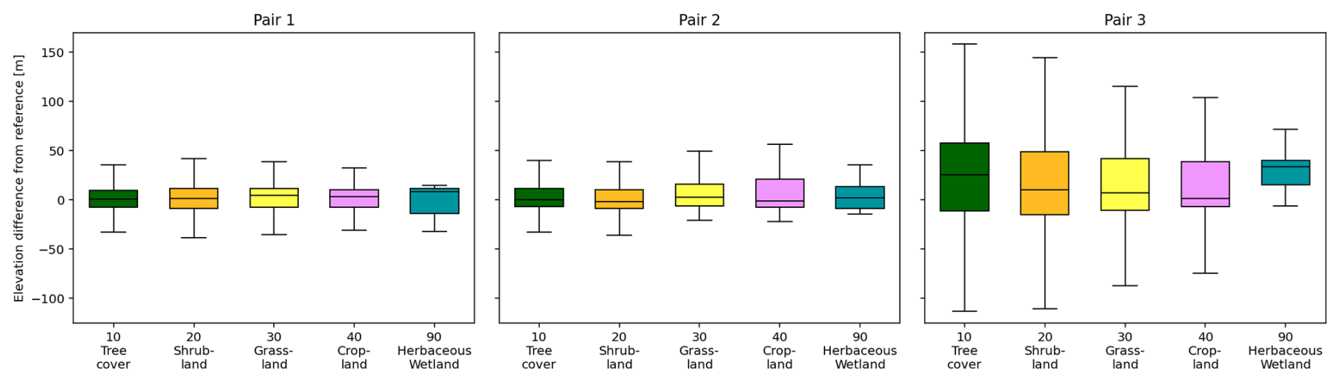 Figure 8 presents boxplots of the elevation deviation by ESA WorldCover class. At first glance, the differences between pair 1 (Btemp 1 d) and pair 2 (Btemp 6 d) are generally small and only Cropland shows a tendency toward positive deviations (95 % percentile increases from 21.1–38.6 m), confirming the quick decorrelation of the signal as explored above. For pair 3 (Btemp 12 d), height uncertainty increases markedly across all classes: interquartile ranges widen throughout all land cover classes, and all medians shift to positive values, indicating systematic overestimation. The effect is strongest for Tree Cover (IQR between −10.9 to +57.5 m; median +25.4 m), followed by Shrubland. Herbaceous Wetland exhibits the strongest overall positive shift. This increase in elevation errors can be attributed to combination of temporal decorrelation and greater unwrapping susceptibility at 12 d which introduces positive biases, particularly in volume-scattering or dynamic classes (Forests, Shrublands, Wetlands). The relative stability up to 6 d and the pronounced degradation by 12 d is consistent with the coherence analysis.