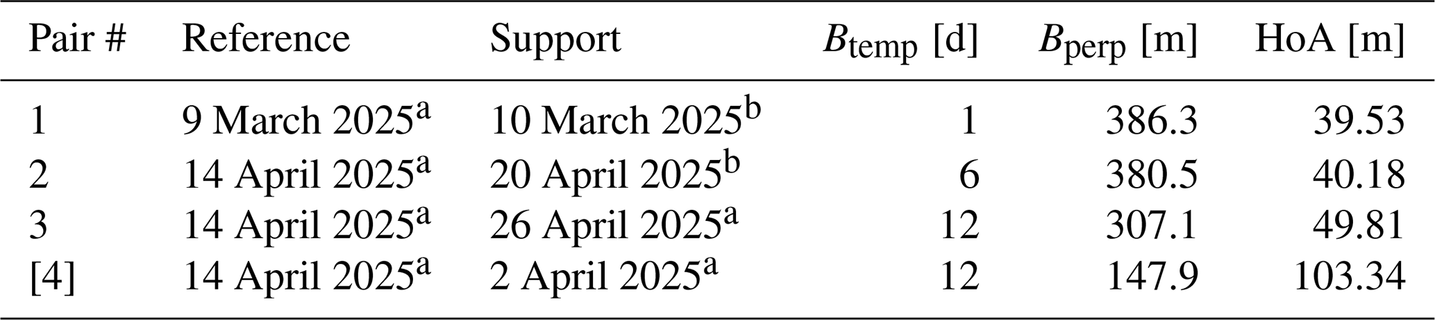 Table 1Interferometric pairs used in this study. Please note that only pairs 1–3 are intensively evaluated in this study and pair 4 was only computed to provide qualitative context for the 12 d result of pair 3.