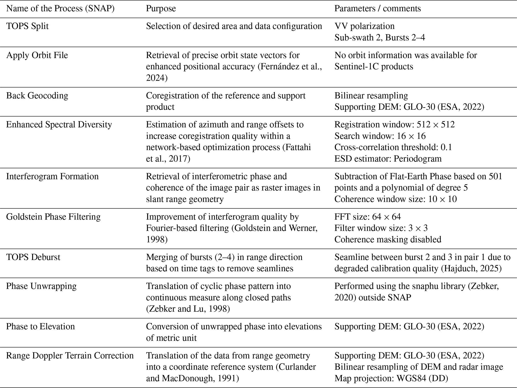 Table 1 lists the image pairs which were identified as suitable for this study, as well as their temporal (Btemp) perpendicular baselines (Bperp) and the resulting height of ambiguity (HoA) which defines the elevation distance which is covered by one phase cycle in the interferogram. It shows that the first three image pairs are comparable with respect to the acquisition geometry. These three pairs (1–3) are the ones that the subsequent analyses are based upon. A fourth pair (pair 4) was additionally analyzed to double-check the typical behavior of a standard 12 d Sentinel-1 repeat cycle under comparable environmental conditions (a maximum perpendicular baseline of only 148 m was available), while acknowledging differences in acquisition geometry that preclude a direct quantitative comparison. Additionally, an analysis of rainfall data of the ERA5 dataset (C3S, 2018) dataset showed that there were no significant rainfall events between all pairs so that quality differences in the derived DEMs can mainly be assigned to the temporal baseline. Full scene identifiers are provided in the appendix to foster reproducibility and transparency.